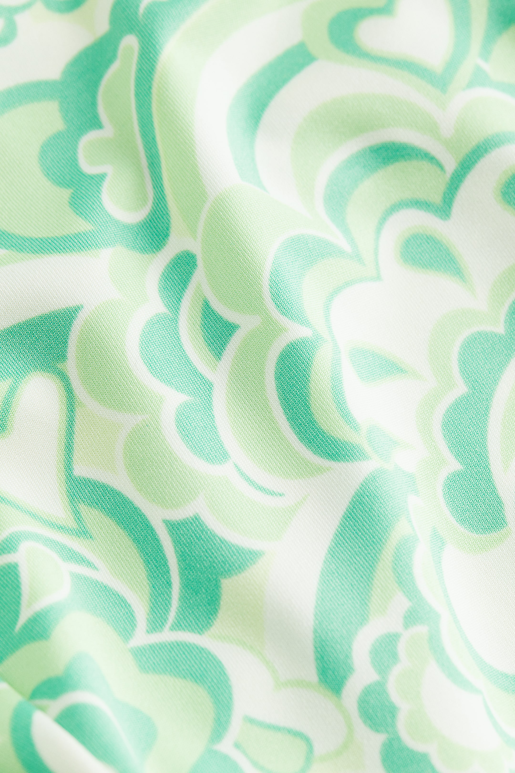Leggings in jersey with a slight sheen. Narrow ties that wrap around and fasten at the waist and legs with flared hems.