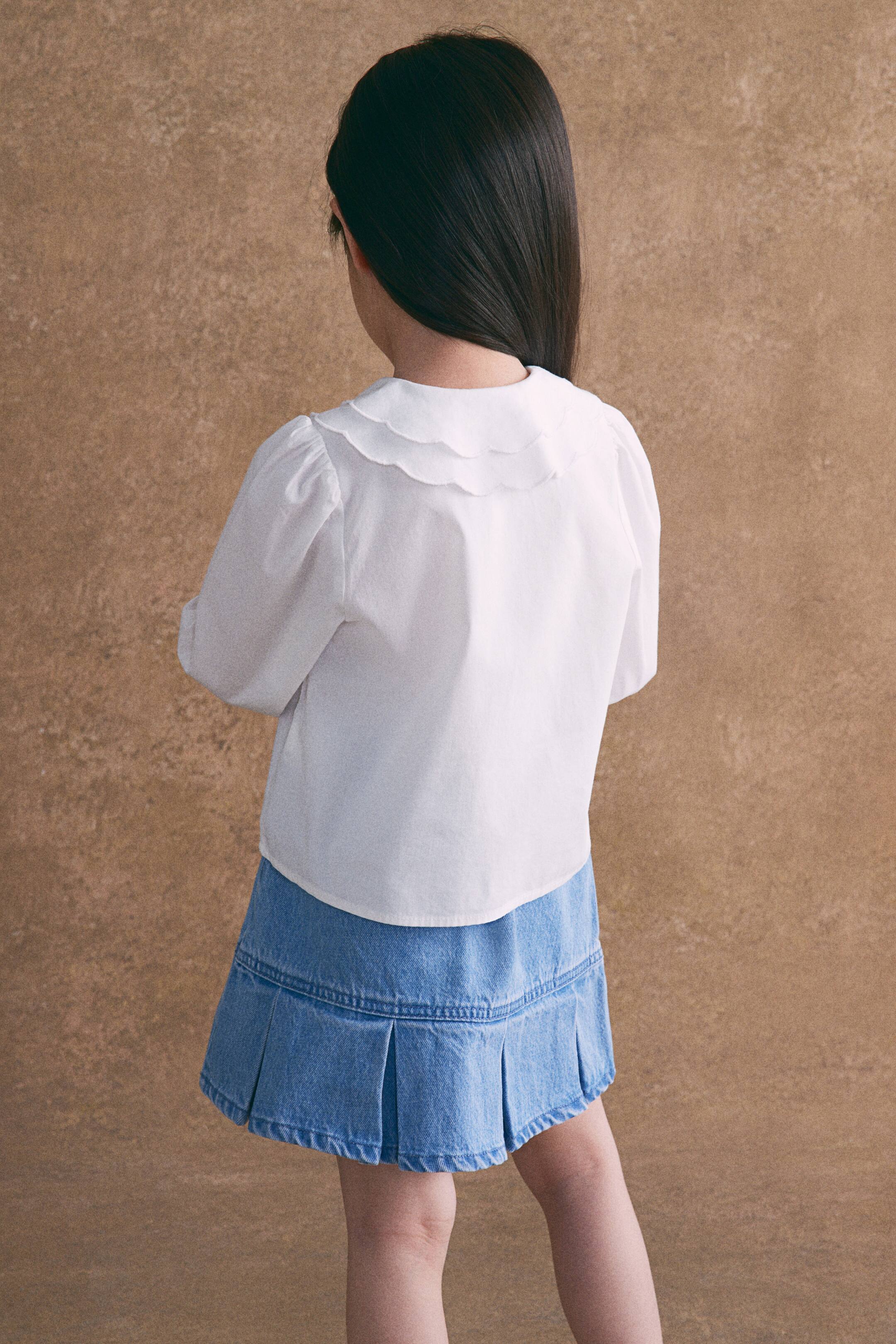 Blouse in soft cotton poplin featuring a double-layered Peter Pan collar with scalloped trims. Buttons down the front, long puff sleeves with elasticated, frilled cuffs and a straight-cut hem.