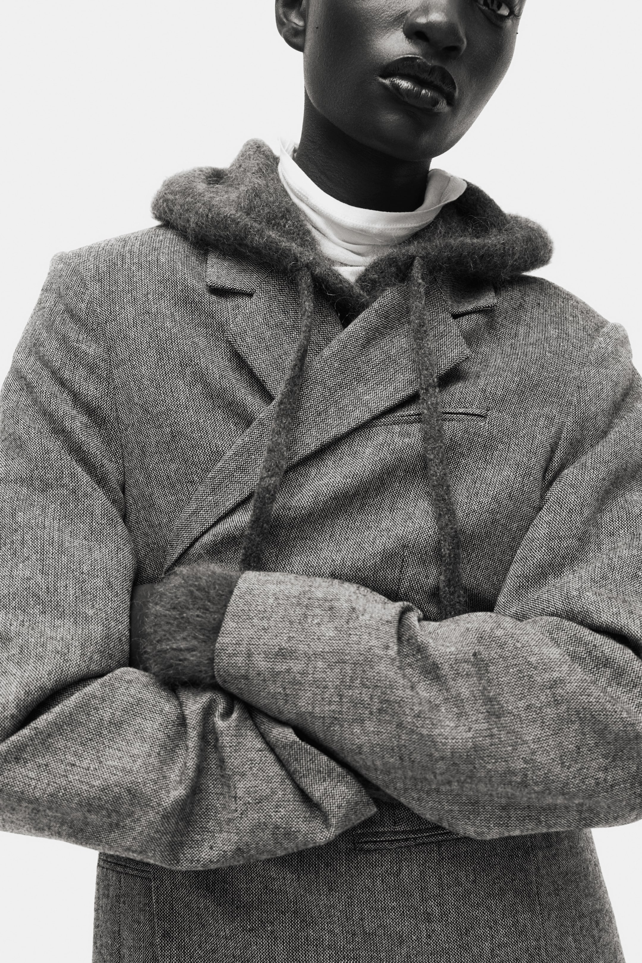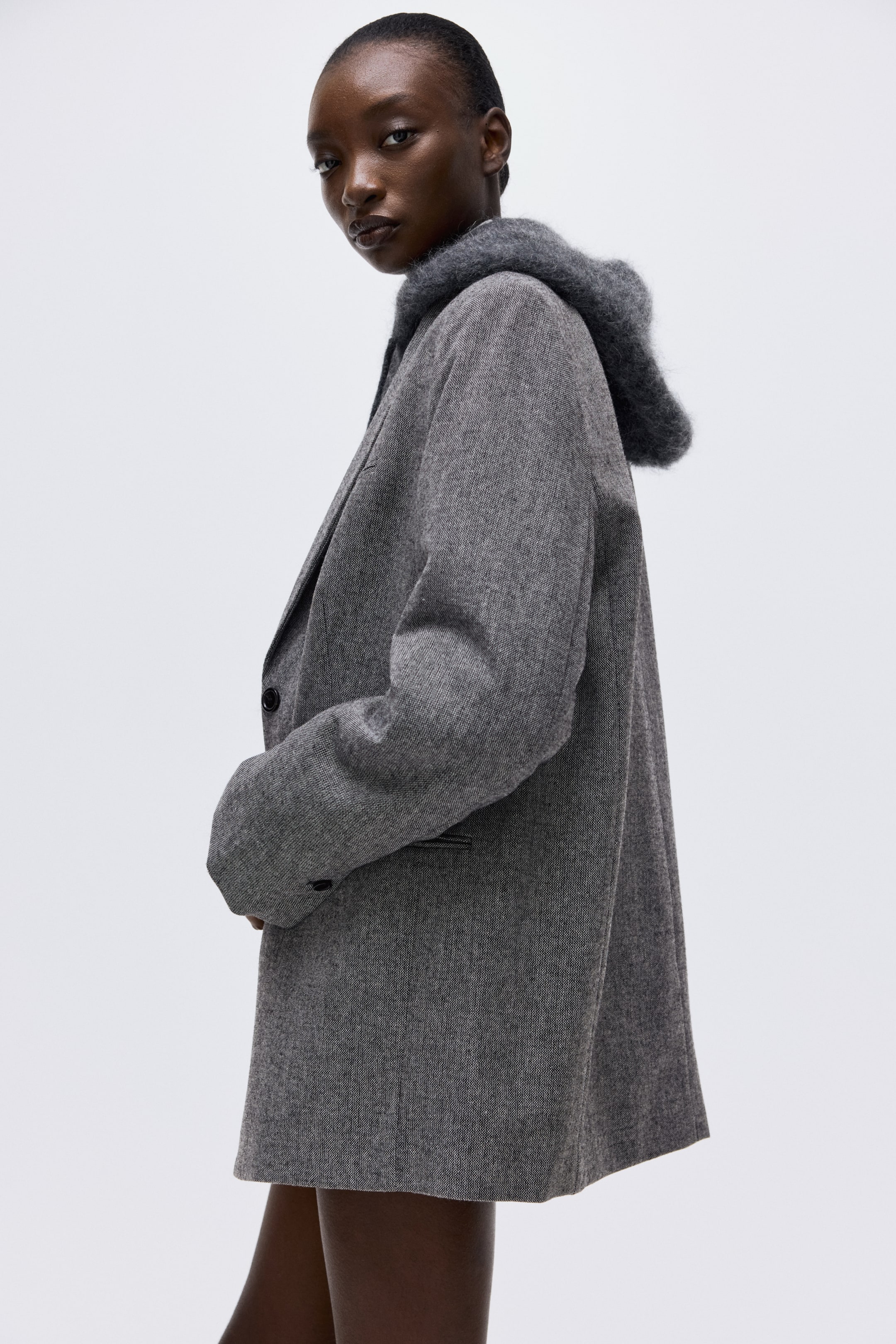 Long, single-breasted blazer in woven fabric with a loose fit. Notch lapels, buttons at the front, a jetted chest pocket and jetted front pockets. Shoulder pads and long sleeves with a slit and button at the cuffs. Lined.