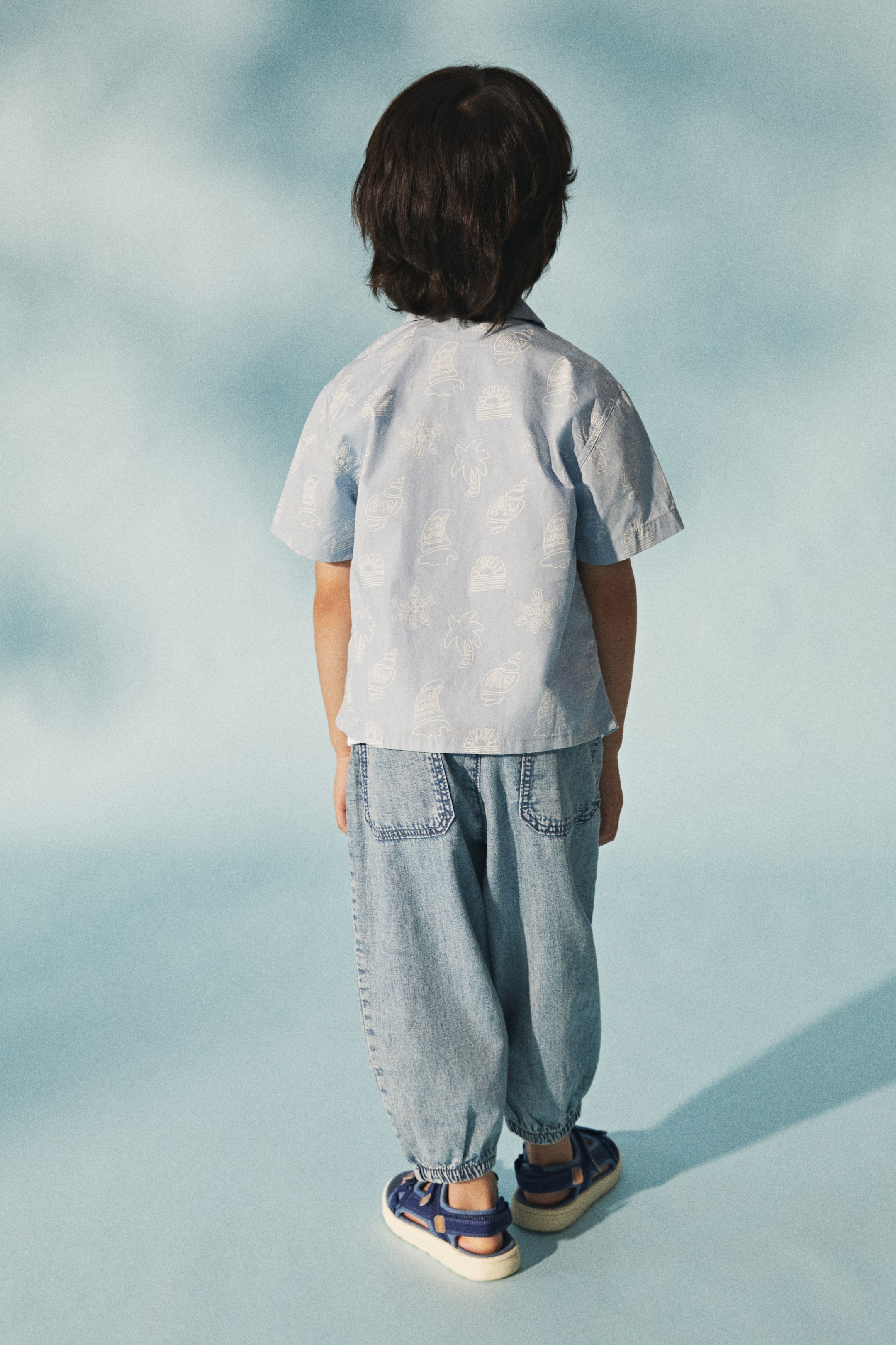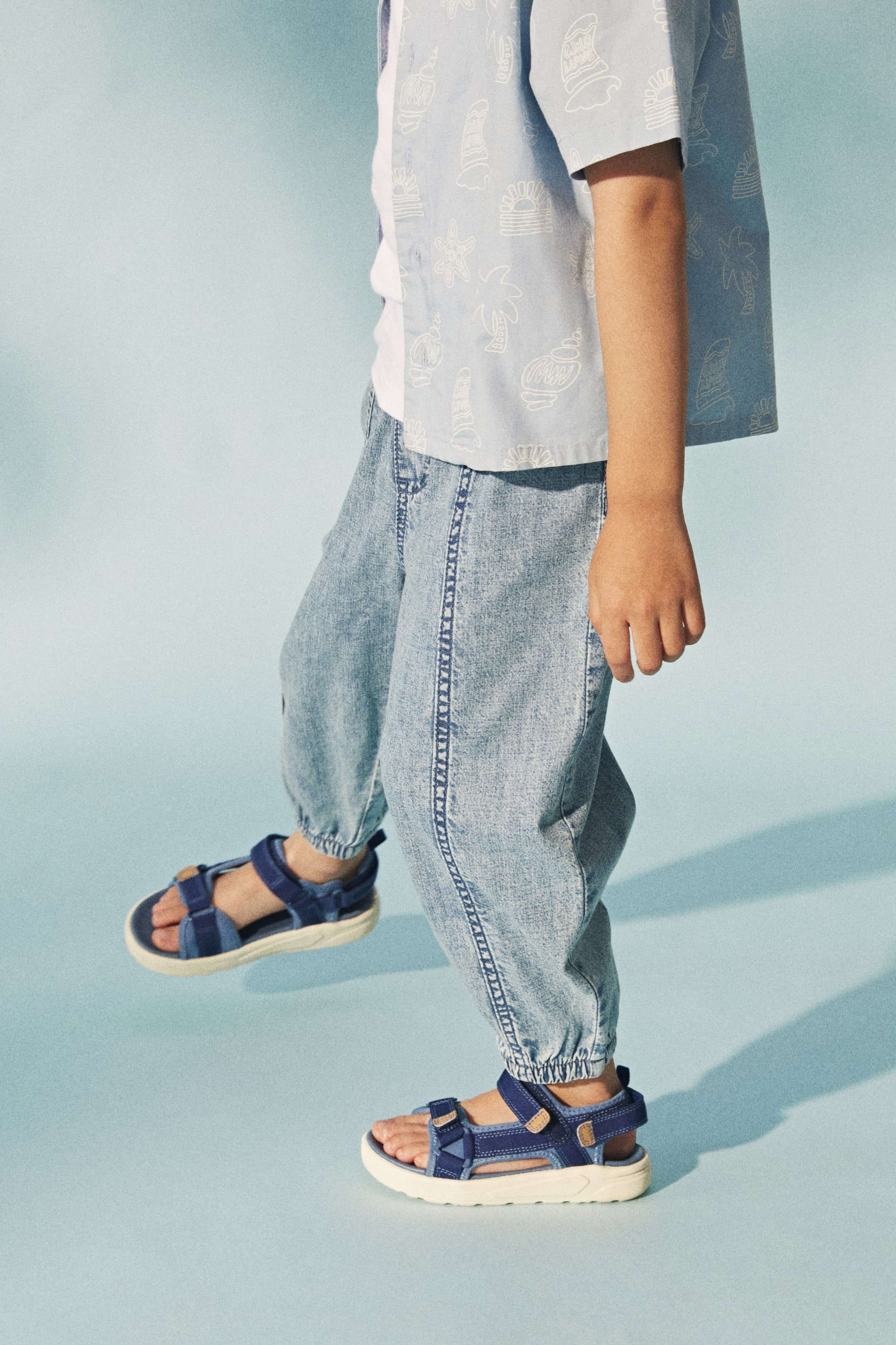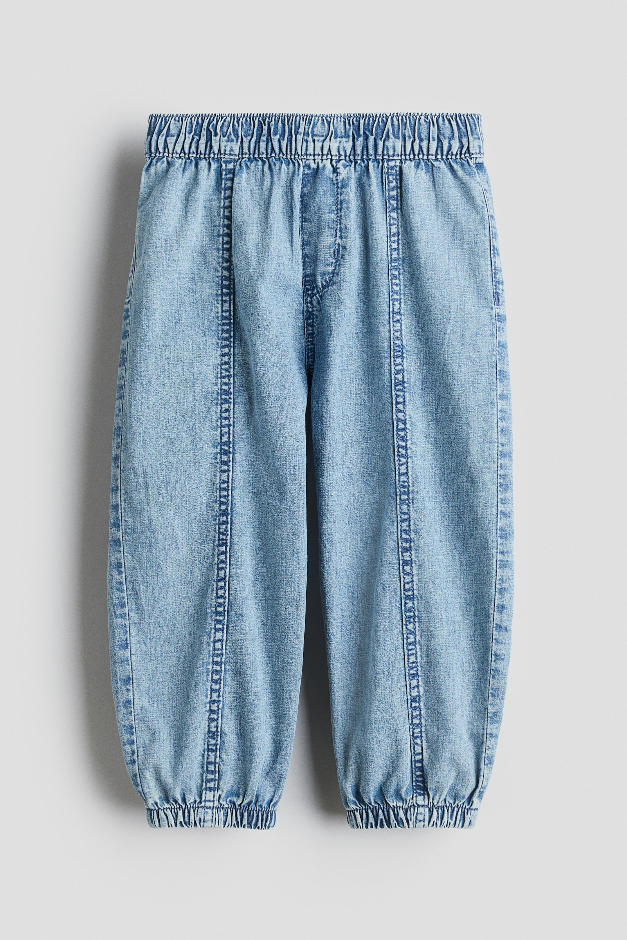 Joggers in soft cotton denim with a fake fly, open back pockets and covered elastication at waist and hems.