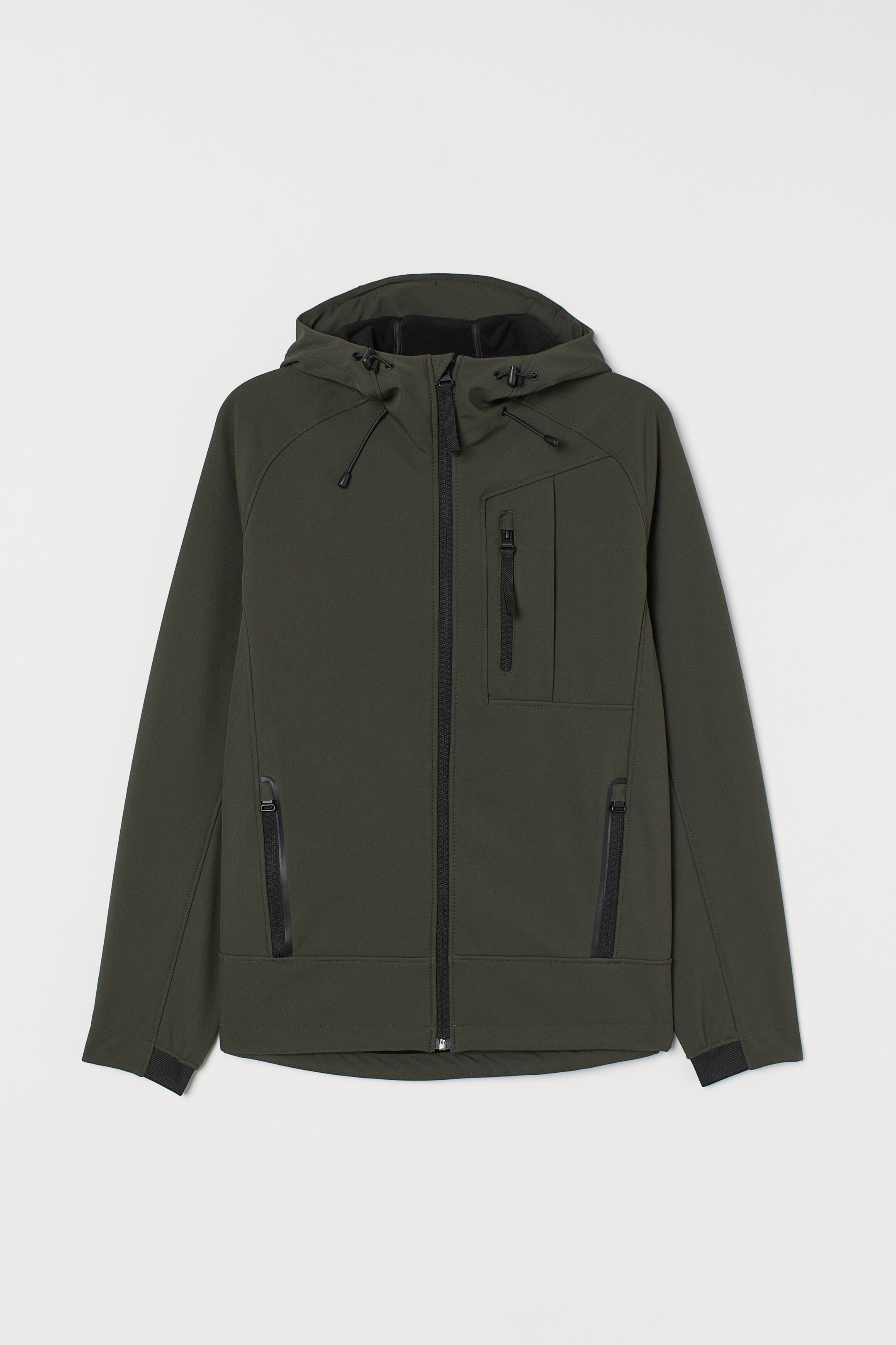 Softshell jacket in water-repellent functional fabric. Hood with elastic drawstring and small visor, zipper at front with chin guard, and elasticized cuffs. Chest pocket with zipper and media outlet inside, side pockets with zipper, and a drawstring at hem. Thermal fleece inside. Size of chest pocket approx. 4 3/4 x 6 3/4 in.