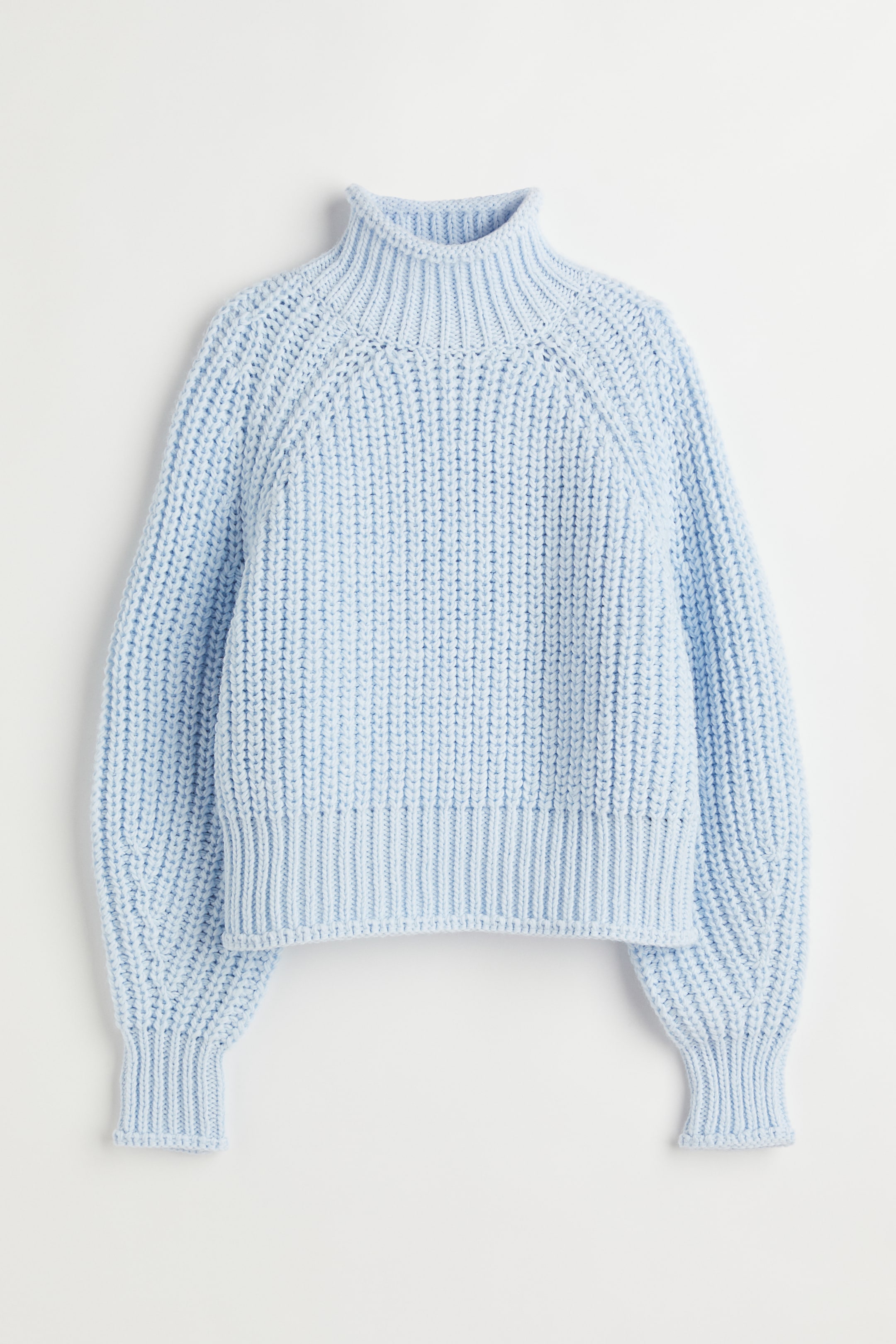 Boxy sweater in soft, knit fabric with wool content. Roll-edge mock turtleneck, long, wide raglan sleeves, and wide, roll-edge ribbing at cuffs and hem.