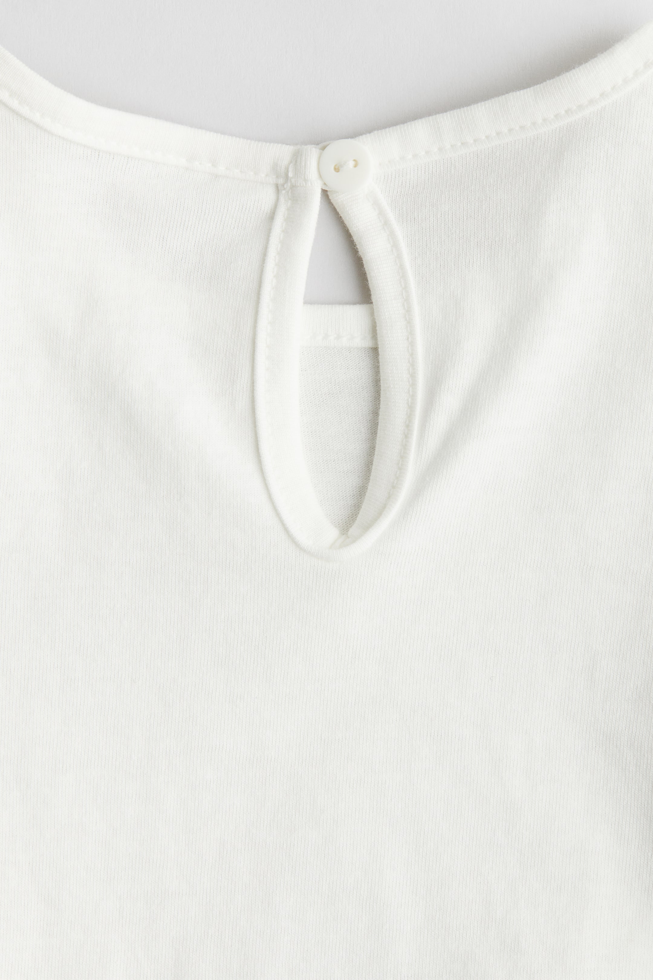 Set with a top in cotton jersey and an overall dress in cotton denim. Top with short, eyelet embroidered sleeves and a small opening at back of neck with button. Overall dress with adjustable, front-fastening straps, buttons at sides, and patch side pockets.