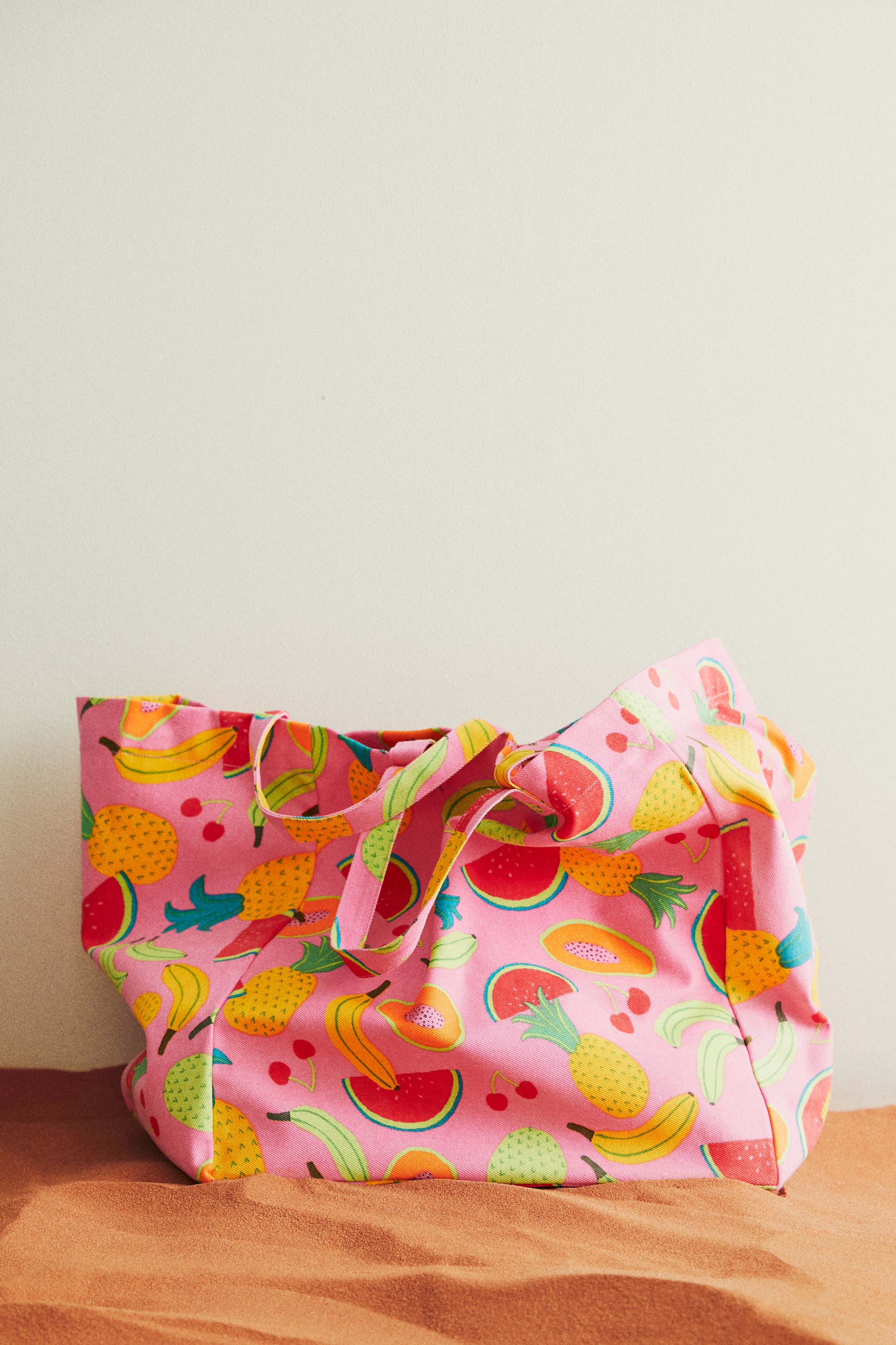 Spacious beach bag in thick cotton twill with a printed pattern. Two pairs of handles at top, ties inside long sides to fasten over opening, and one inner compartment. Unlined. Depth 11 3/4 in. Width 15 3/4 in. Height 16 1/2 in.