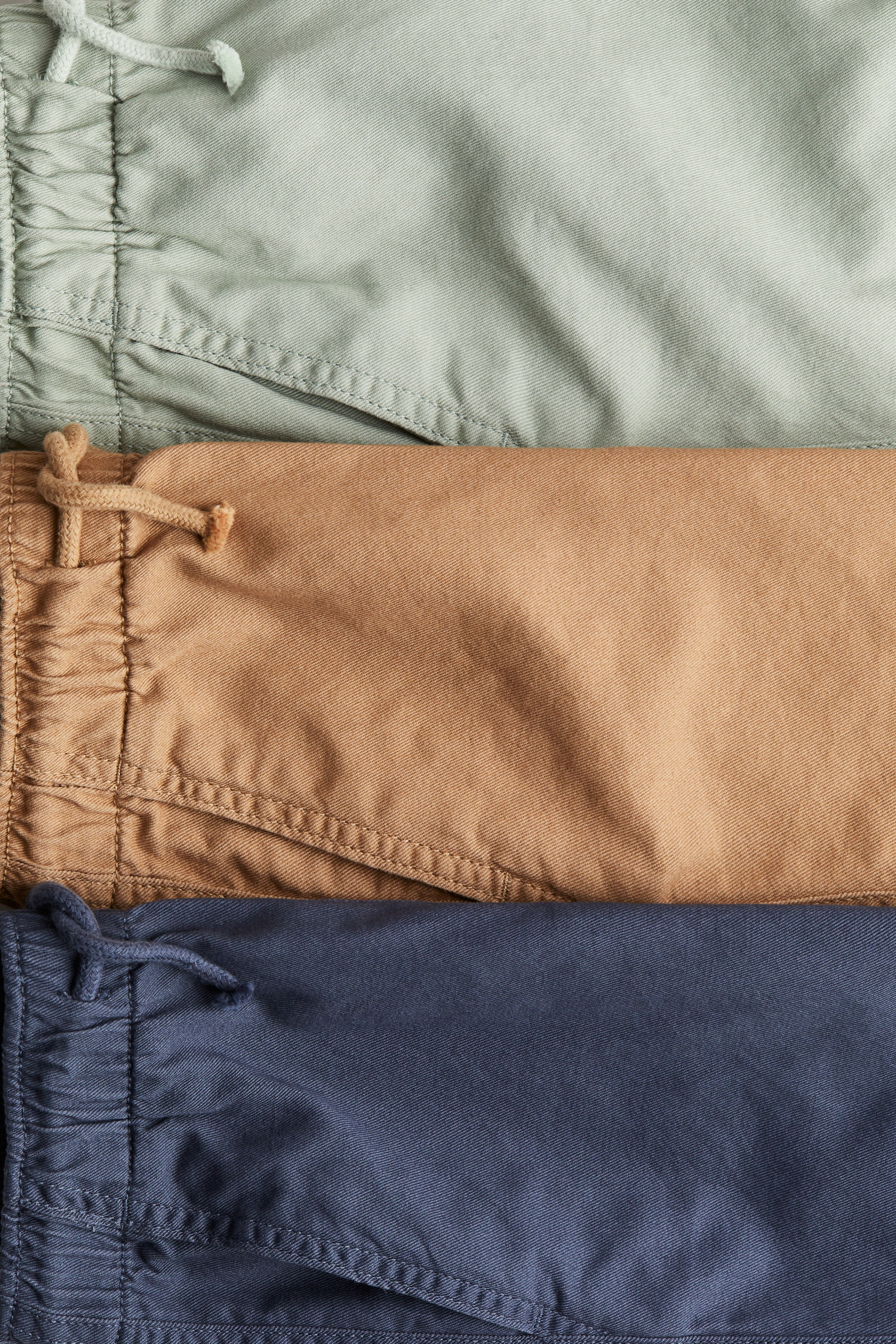Joggers in cotton twill. Elasticized, drawstring waistband, mock fly, and diagonal side pockets. Straight legs with pleats at knees and elasticized hems.