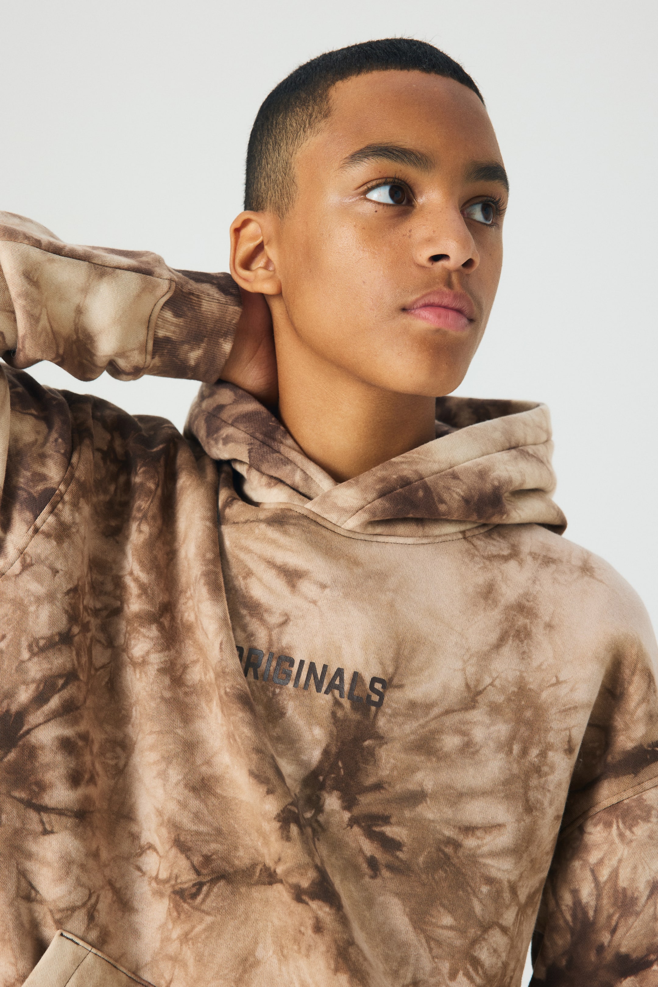Loose-fit sweatshirt hoodie with soft, brushed inside. Double-layered, wrapover hood, dropped shoulders, long sleeves, and a kangaroo pocket. Ribbing at cuffs and hem.