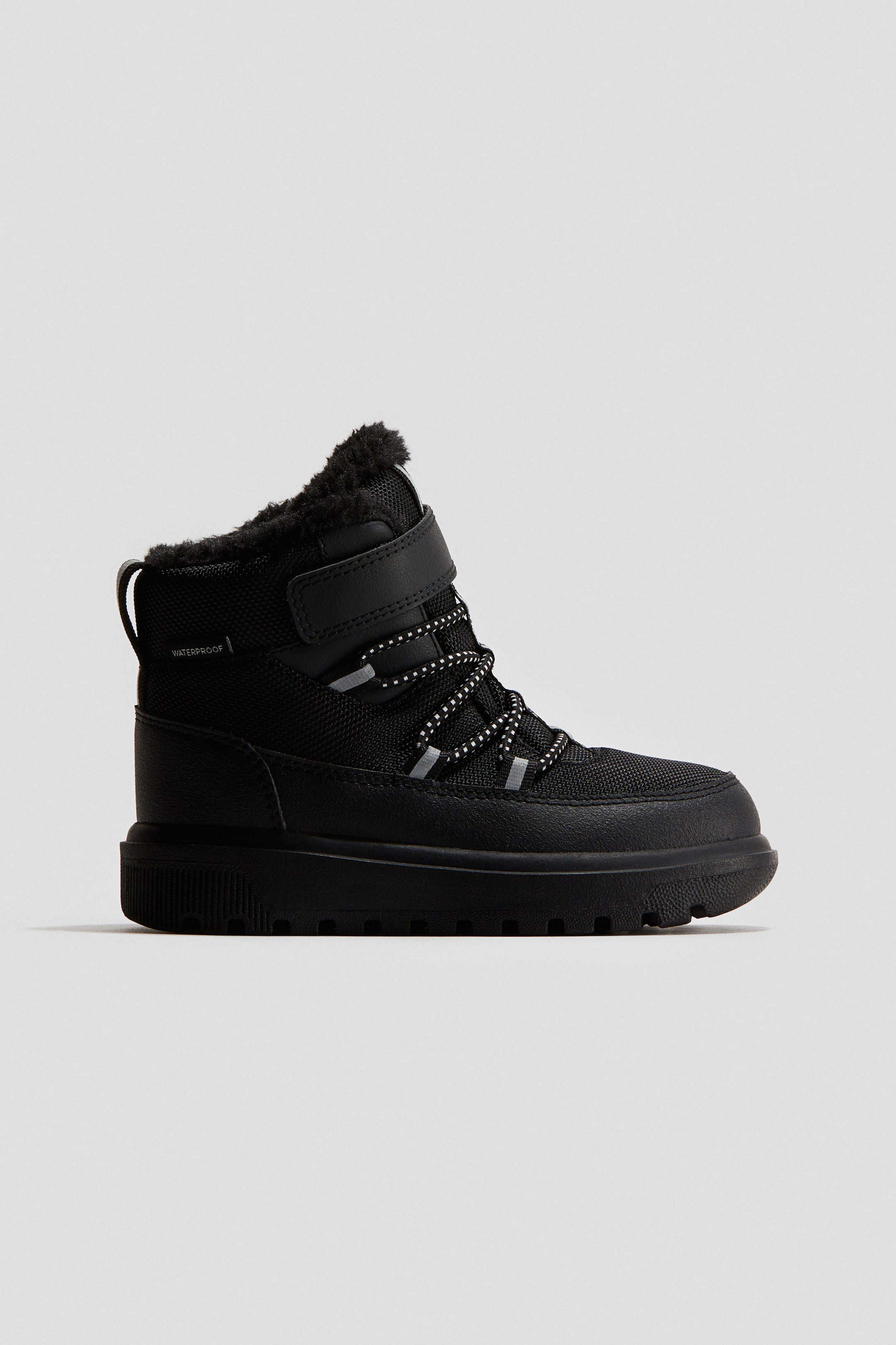 Warm-lined high tops with a waterproof membrane to keep feet dry in snow and rain. Elasticized lacing and hook-loop tab at front, a loop at back to get shoes on and off with ease, and reflective details. Fluffy lining and insoles in Cellfit™ technical foam for added comfort. Chunky soles with good grip. Sole thickness 1 1/4 in.