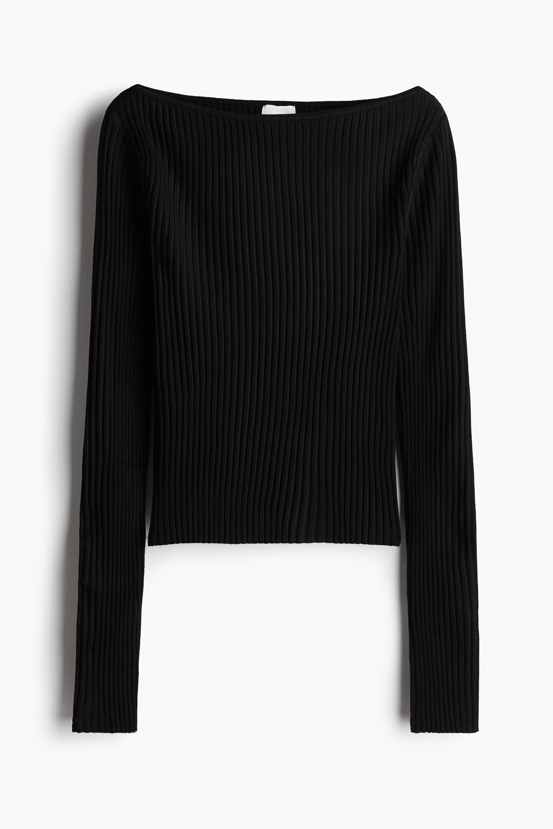 Short, fitted top in a fine rib knit made from a viscose blend. Delicate boat neck with narrow trim, long sleeves with slit at cuffs, and a straight hem.