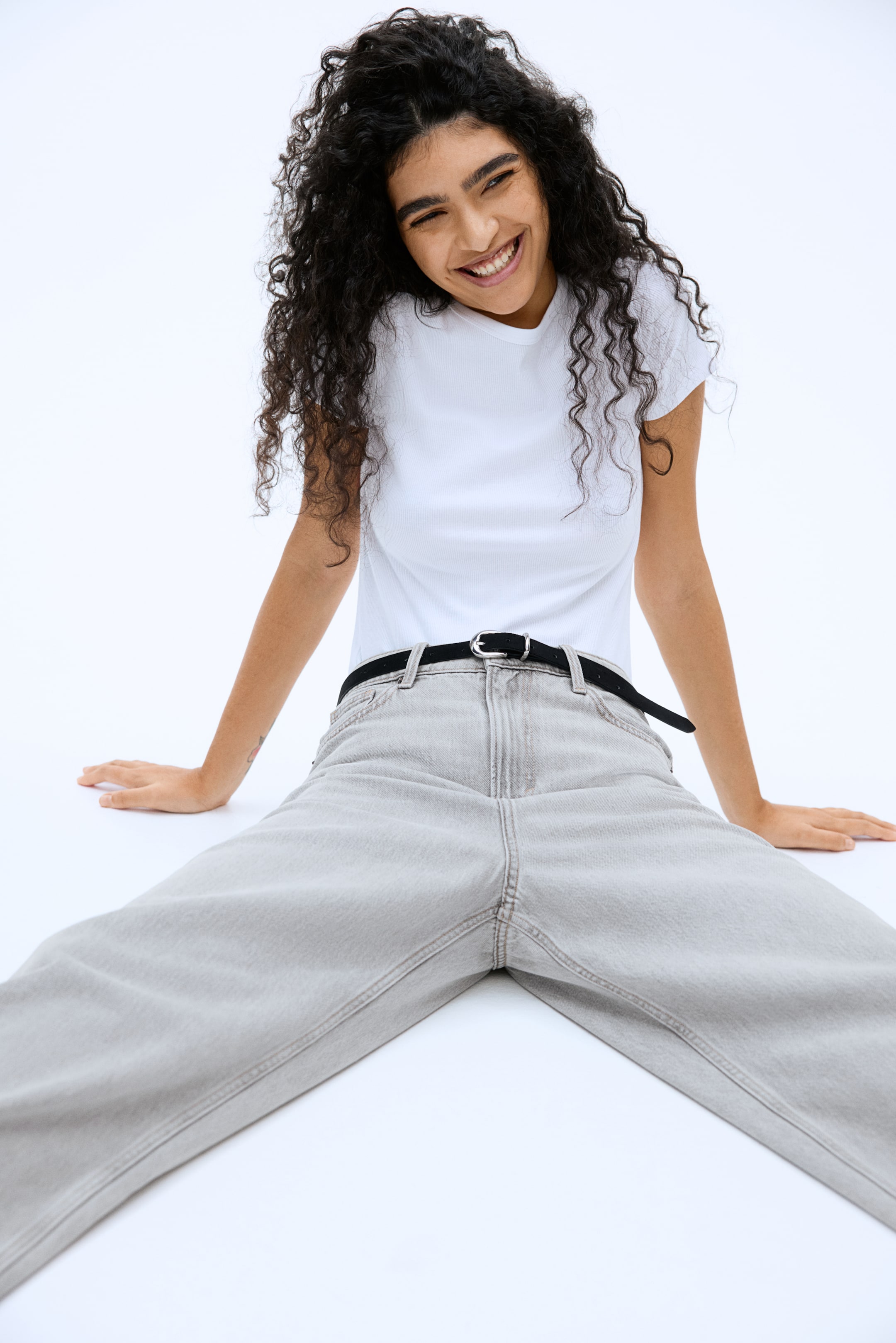 5-pocket jeans in rigid denim that feels firm at first, softening and relaxing with wear. Loose fit from hip to thigh. High waist and zip fly with button. Voluminous, curved legs, tapered to hems. Regular length, designed to fall at top of foot with little or no stacking. A relaxed and cool denim statement.