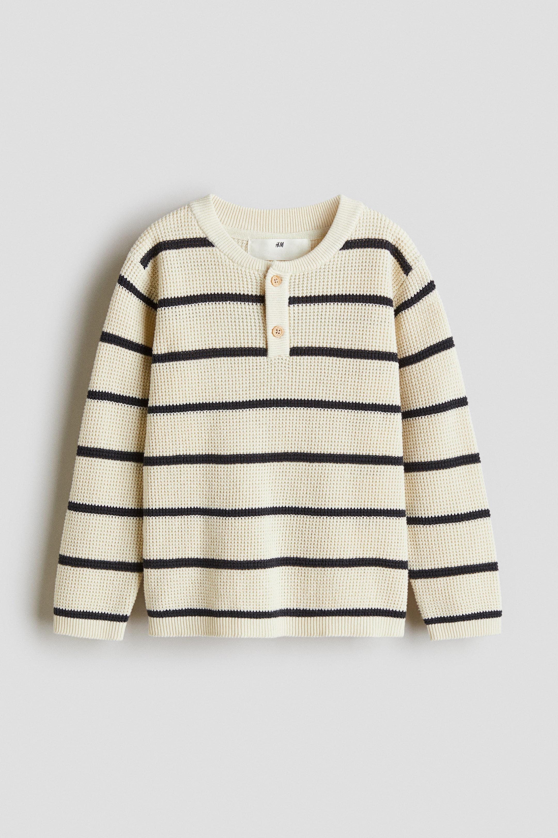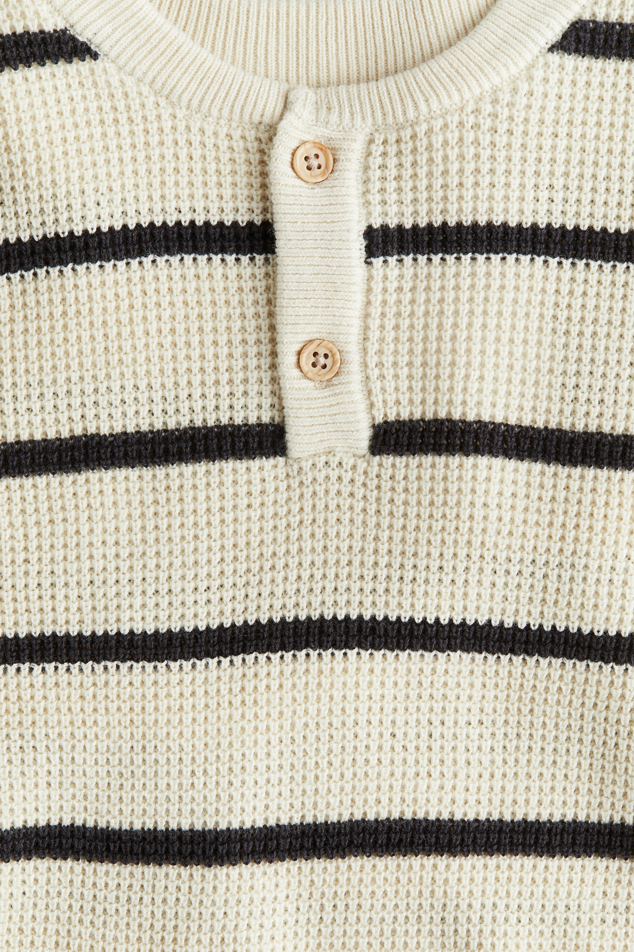 Waffle-knit sweater in soft cotton. Ribbed henley collar, dropped shoulders, and ribbing at cuffs and hem.