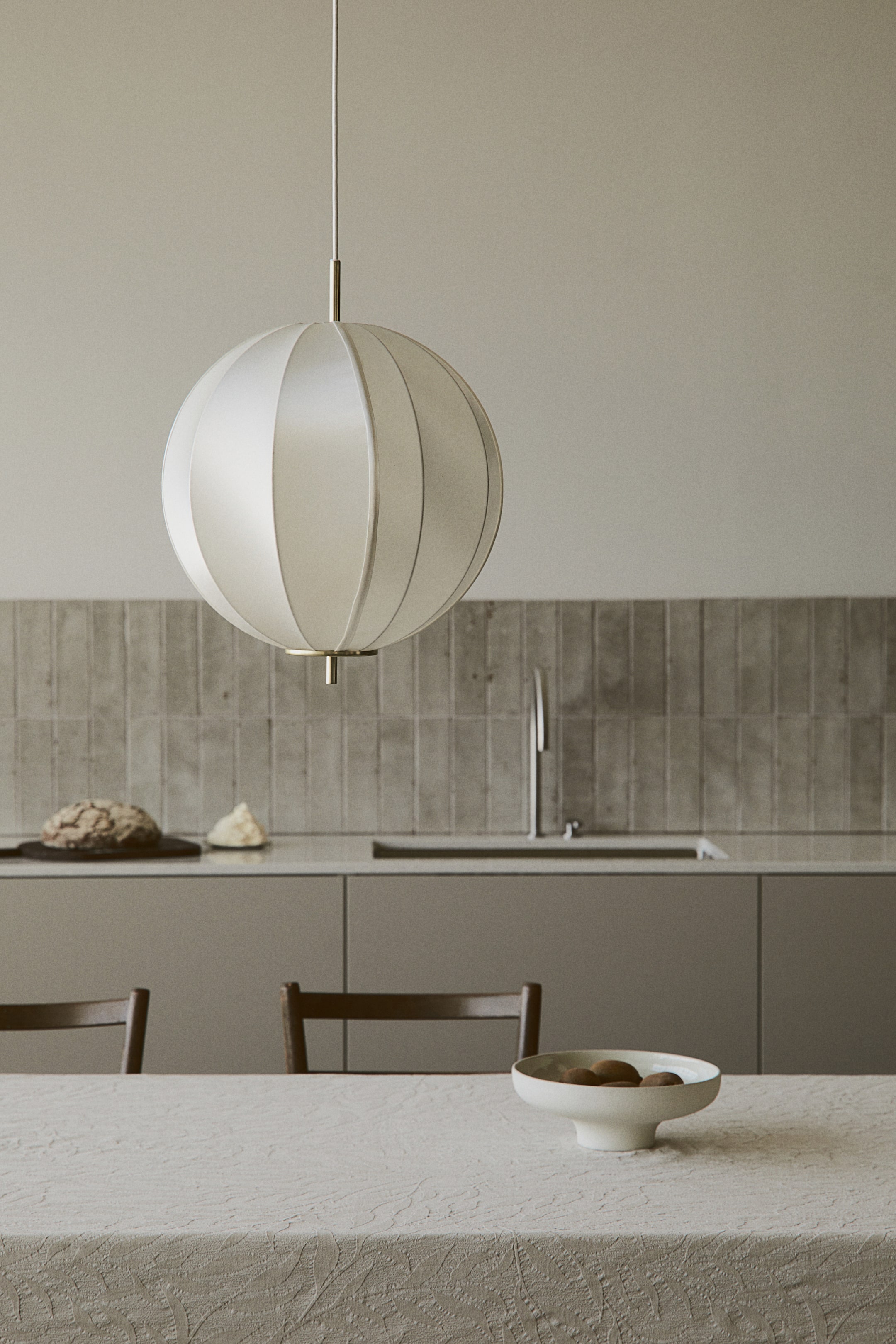 Spherical pendant lamp in fabric and metal. Fabric-covered cord. E26 socket. Max 6 W LED. Bulb not included. Length of cord 6 ft. 7 in. Diameter of lamp 15 3/4 in.