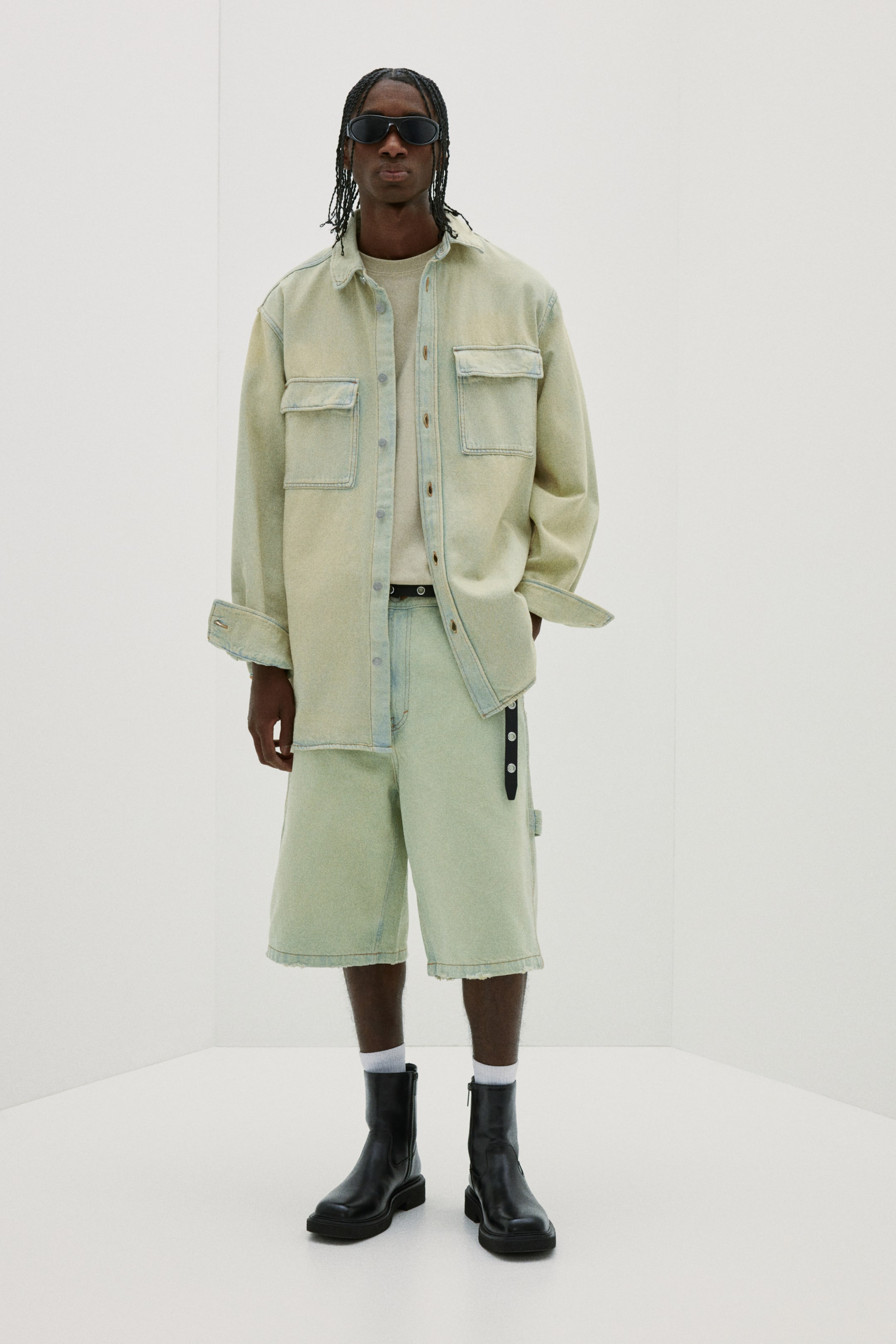 Shorts in rigid cotton denim. Baggy fit from seat to hems with plenty of room around thighs. Regular waist and zip fly with button. Side pockets, open back pockets, a two-part patch pocket on one leg, and a hammer loop on other leg. Rounded, knee-length legs.