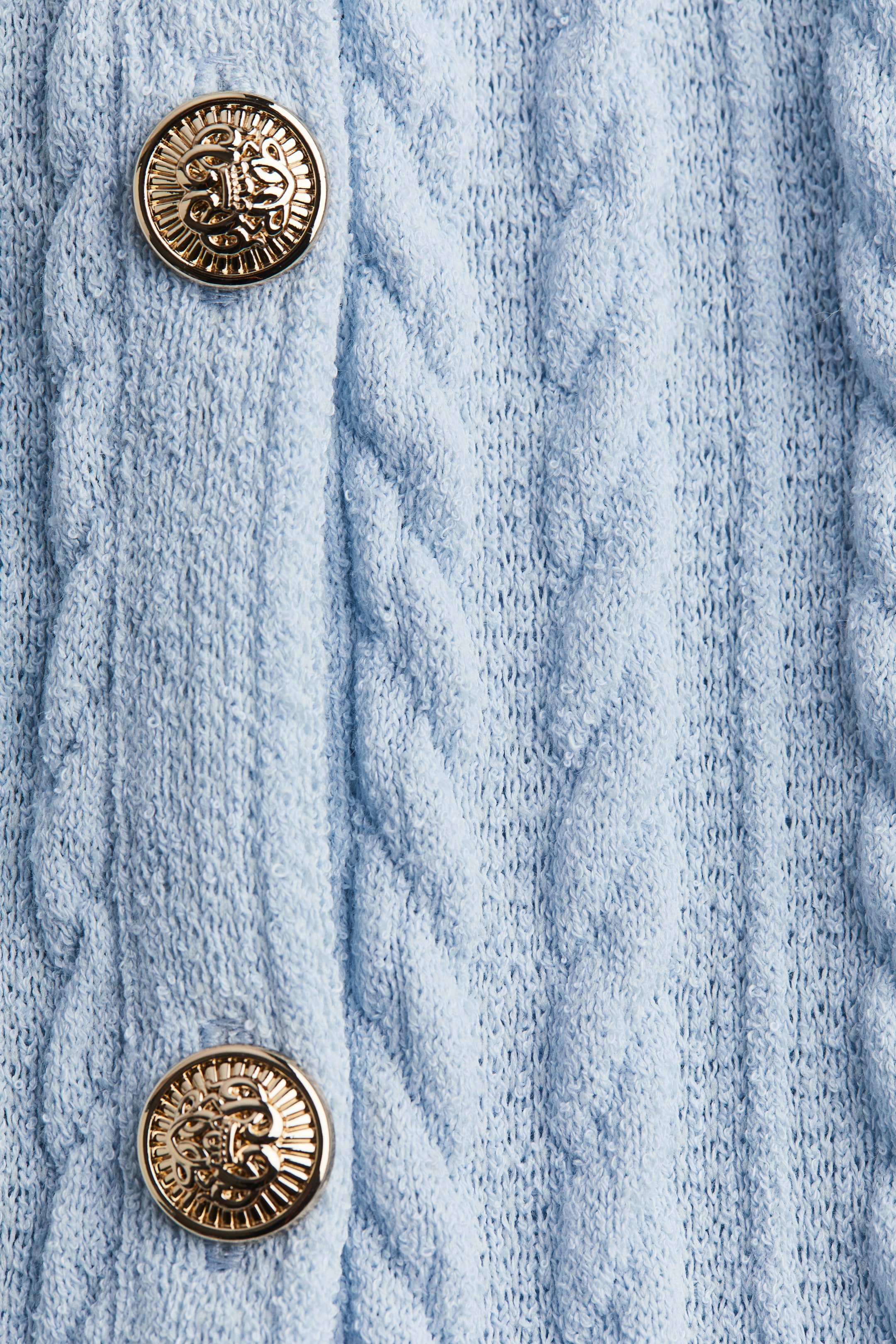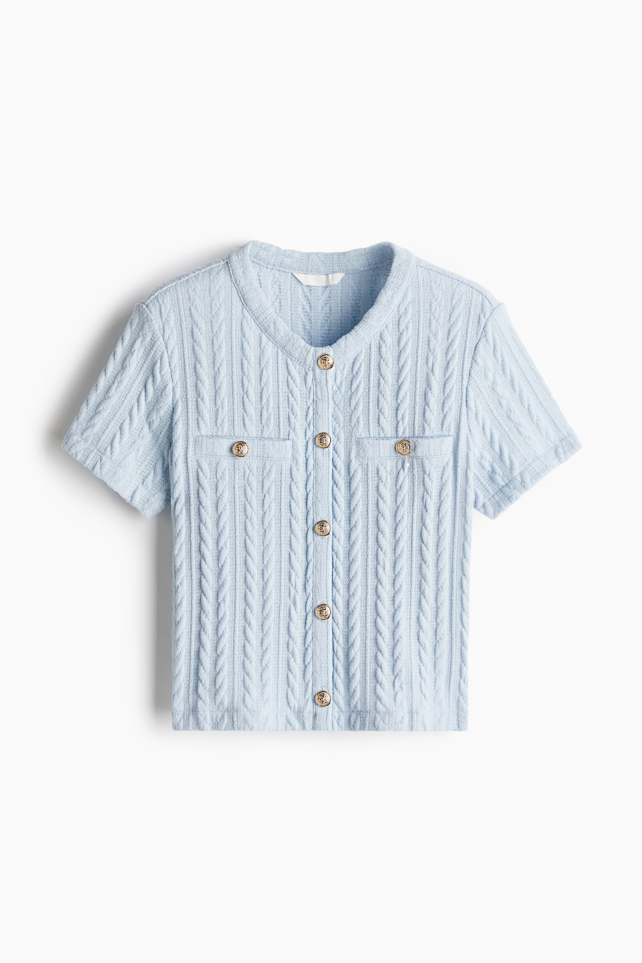 Cardigan in a fine cable knit. Round neckline, buttons at front, and mock welt chest pockets with button. Short sleeves.