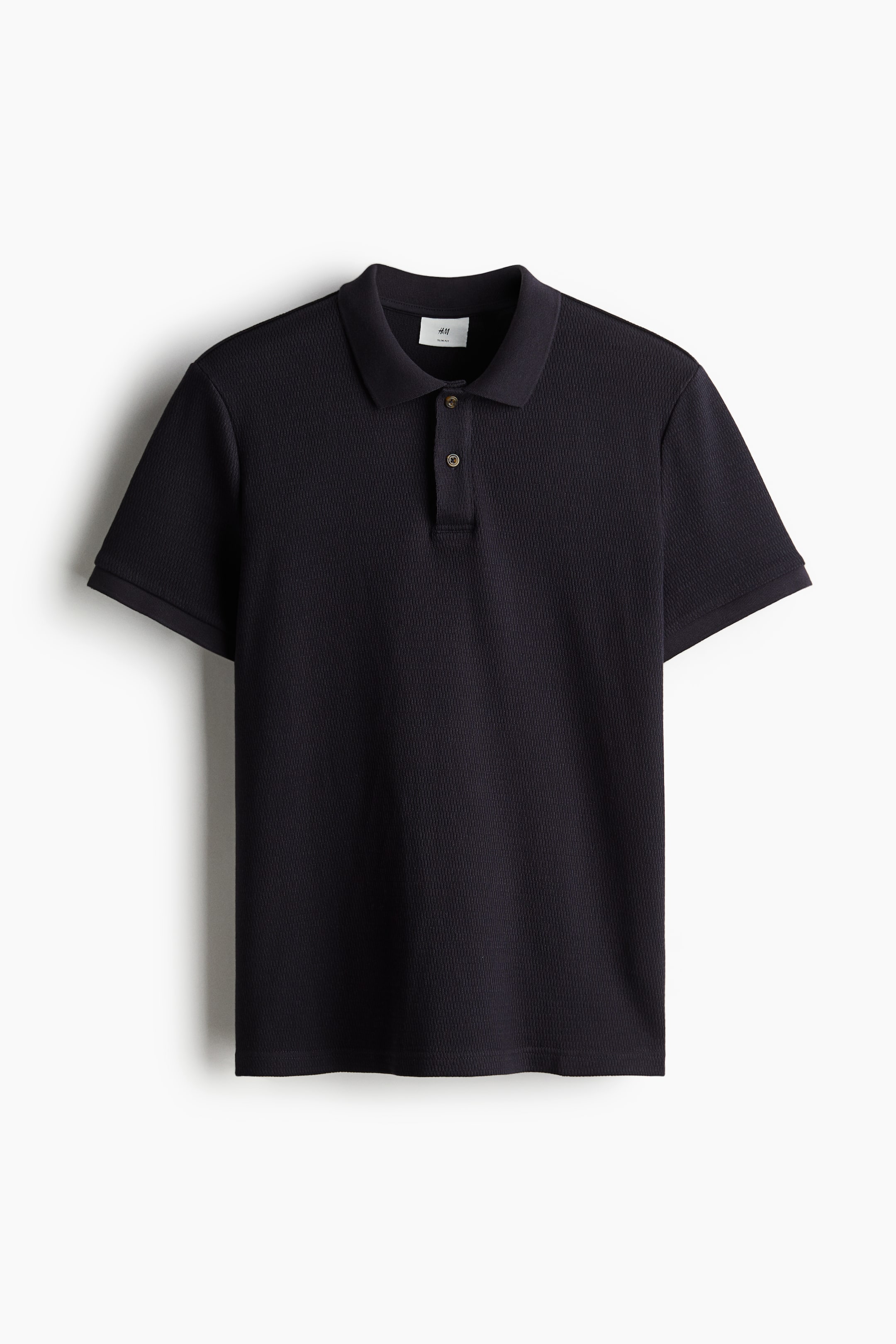 Slim-fit polo shirt in a soft cotton knit with a fitted silhouette. Collar, button placket, and short sleeves. Straight hem.