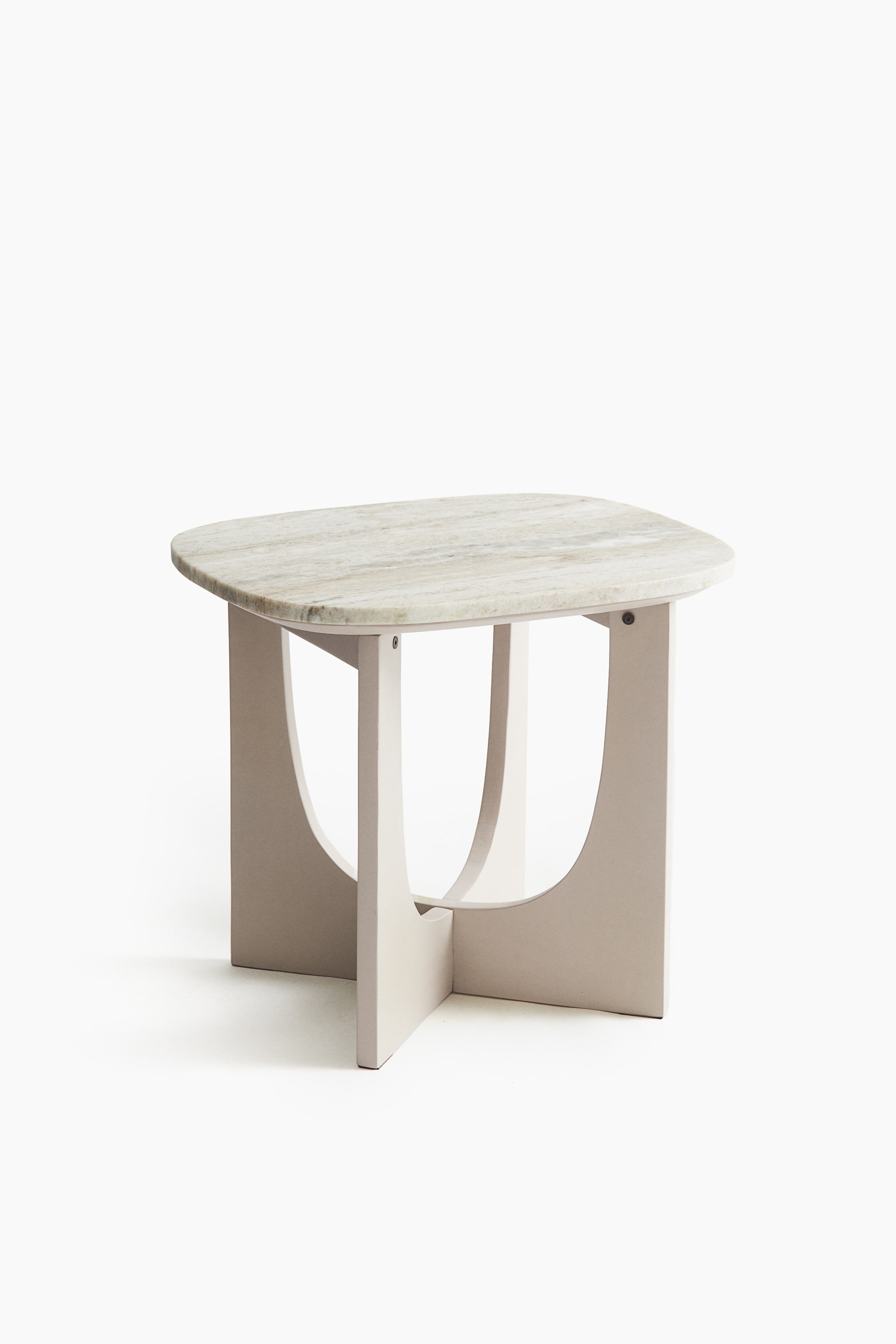 Elevate your living space with this sophisticated end table showcasing a fusion of classic materials and contemporary design. Stylish tabletop in marble and two robust legs in pine. Legs intersect at the center, forming a refined blend of straight and curved lines. Supplied flat-packed, ready to assemble. Width 20 in. Height 17 1/4 in. Depth 16 1/2 in.