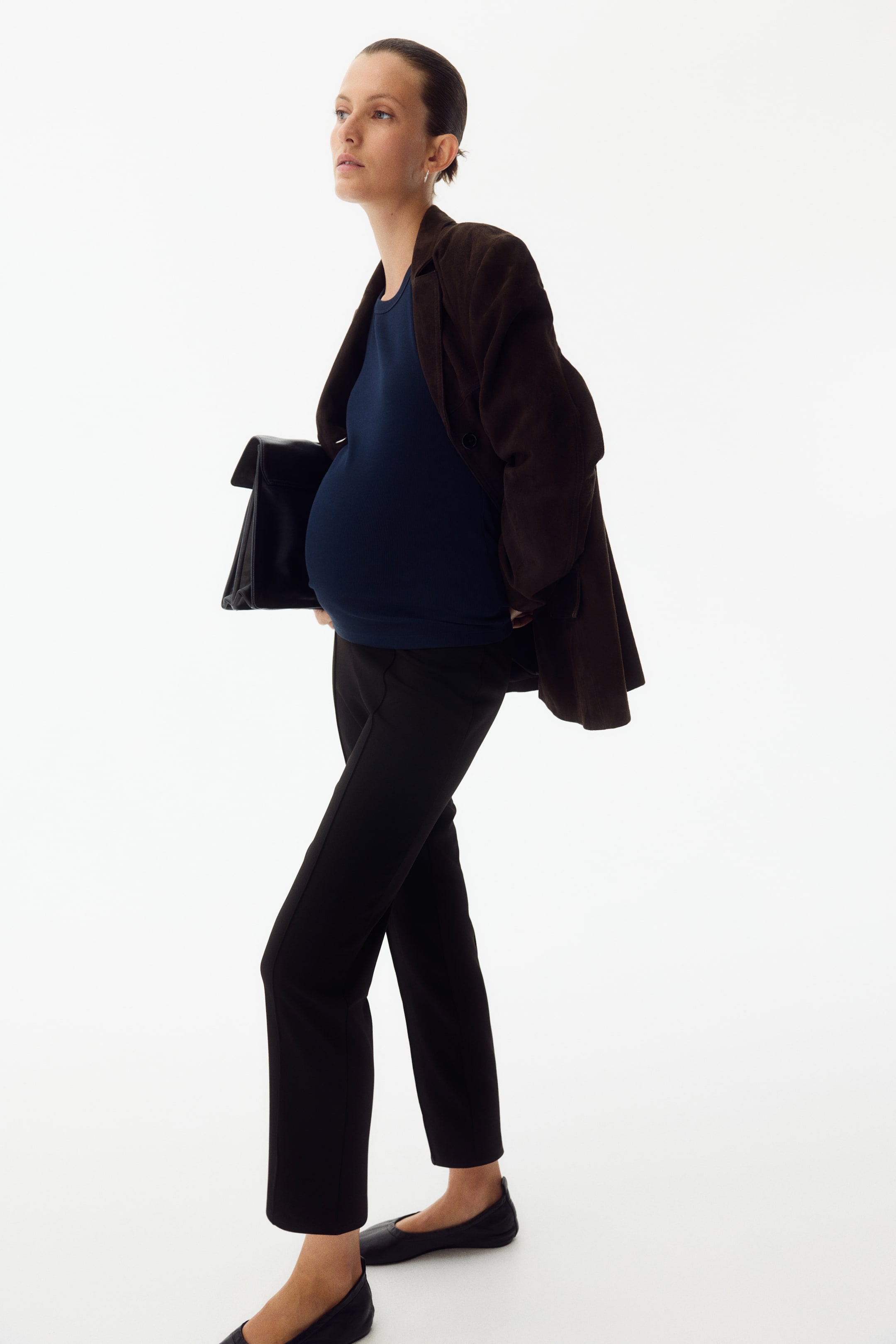 Pants in thick jersey with stitched creases at front and back. Wide jersey panel at waist for best fit. Tapered legs.