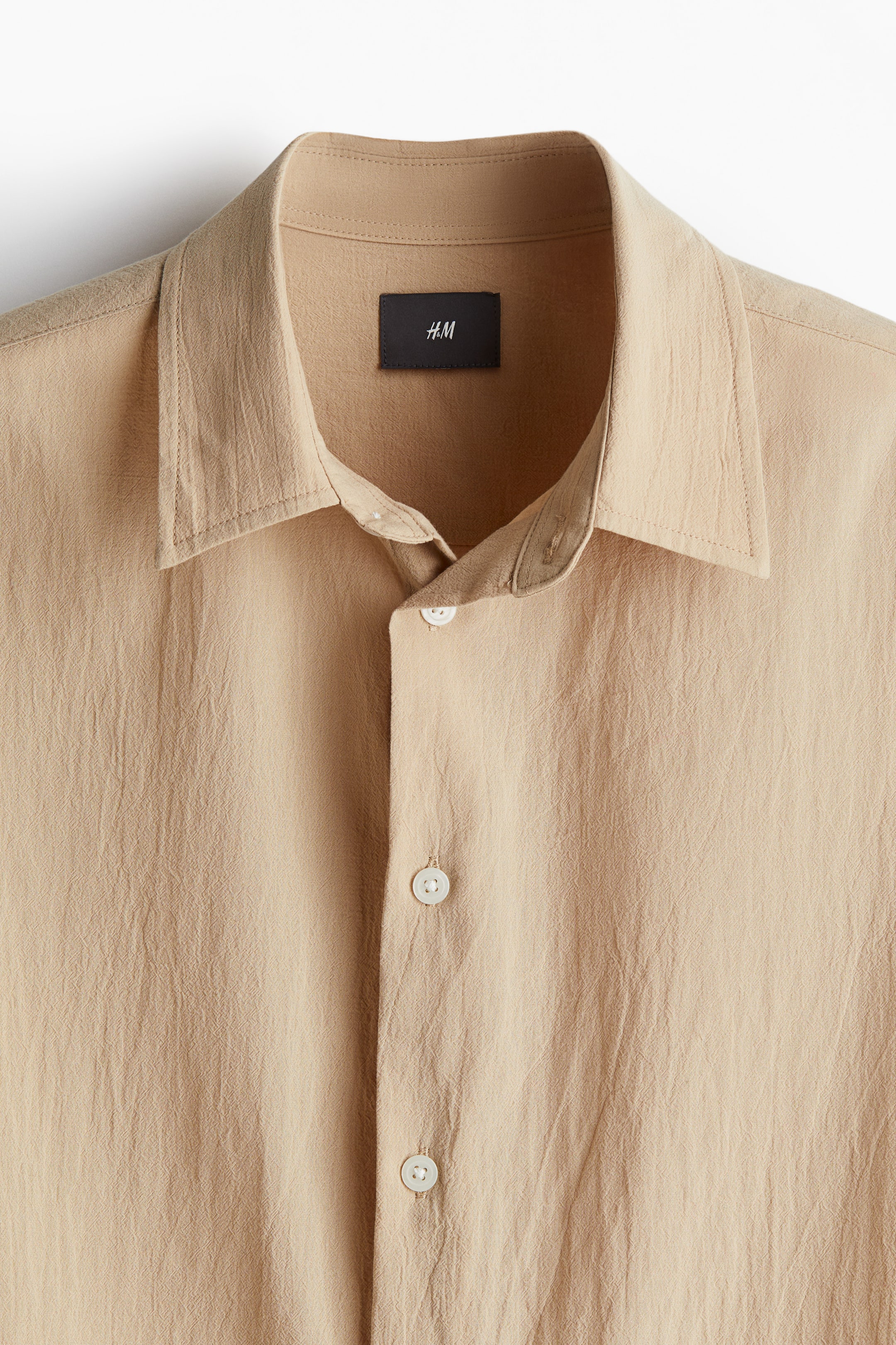 Loose-fit shirt in woven, crinkled cotton with a generous but not oversized silhouette. Turn-down collar, buttons without placket, yoke at back, and short sleeves. Straight-cut hem with slit at sides.