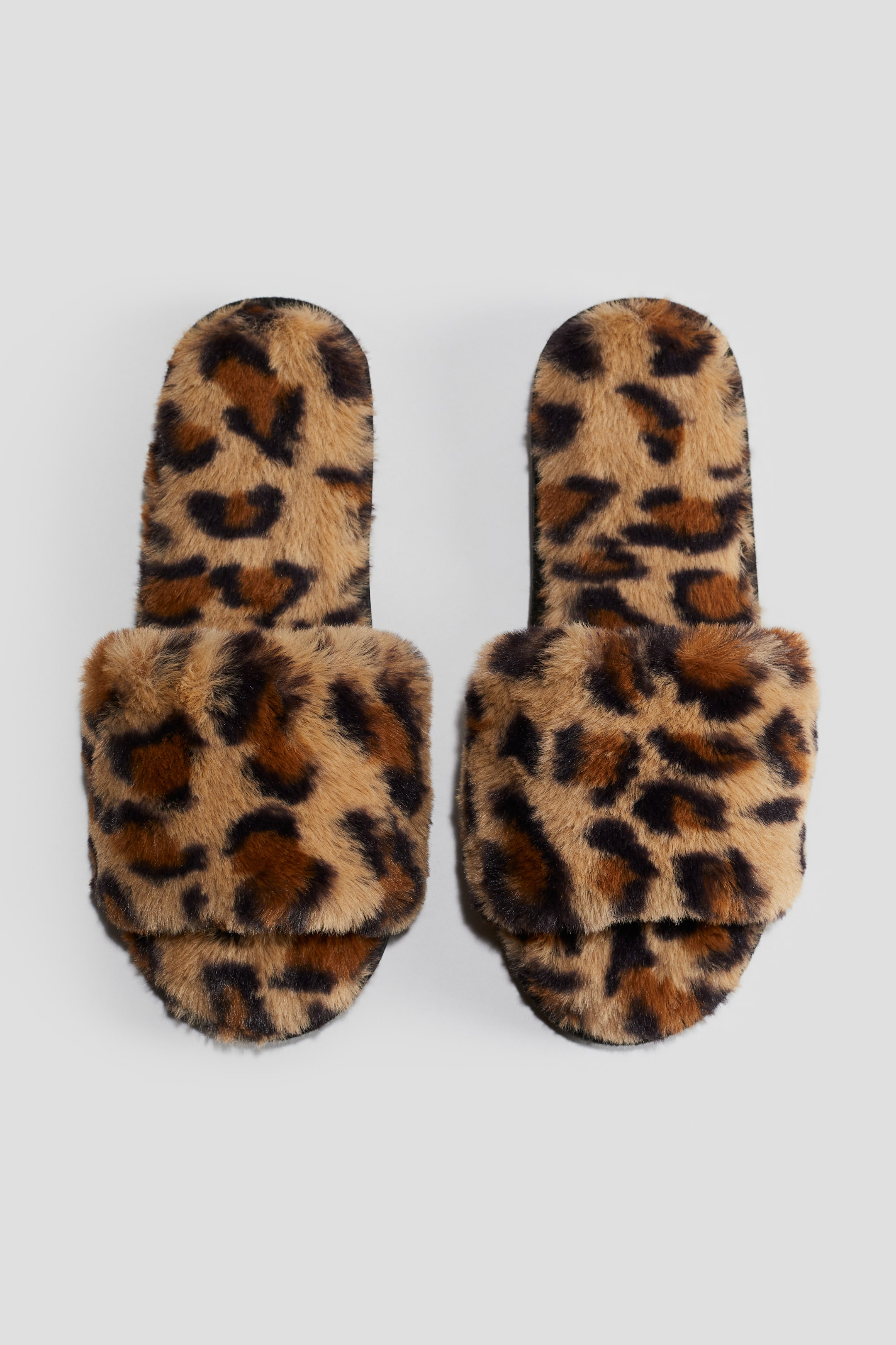 Slippers in soft, fluffy fabric with a wide foot strap. Patterned soles. Sole thickness 1/2 in.