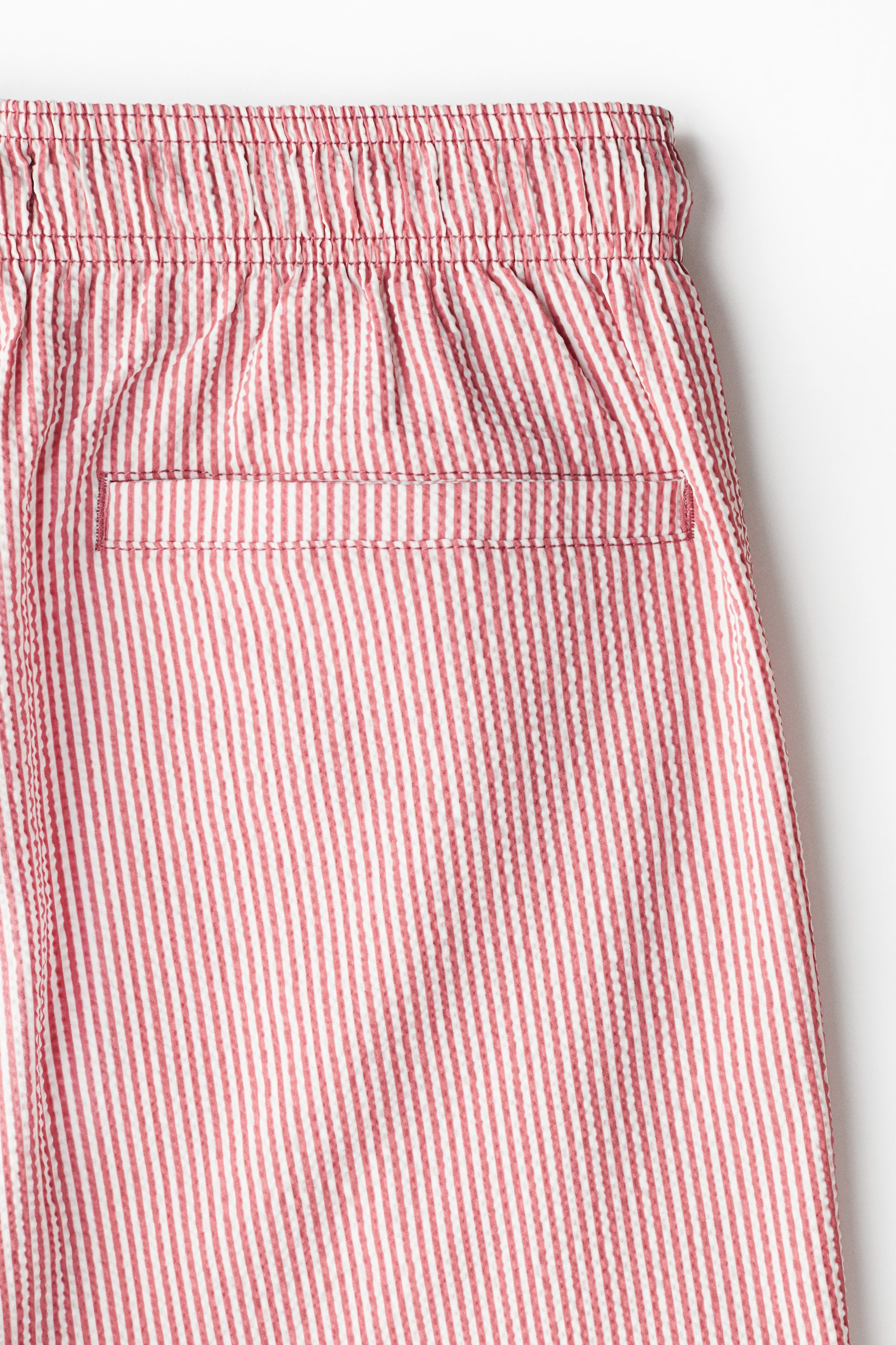 Swim shorts in seersucker. Drawstring and covered elastic at waistband, side pockets, and a back pocket with hook-loop fastener. Small slit at sides of hems. Mesh liner shorts.