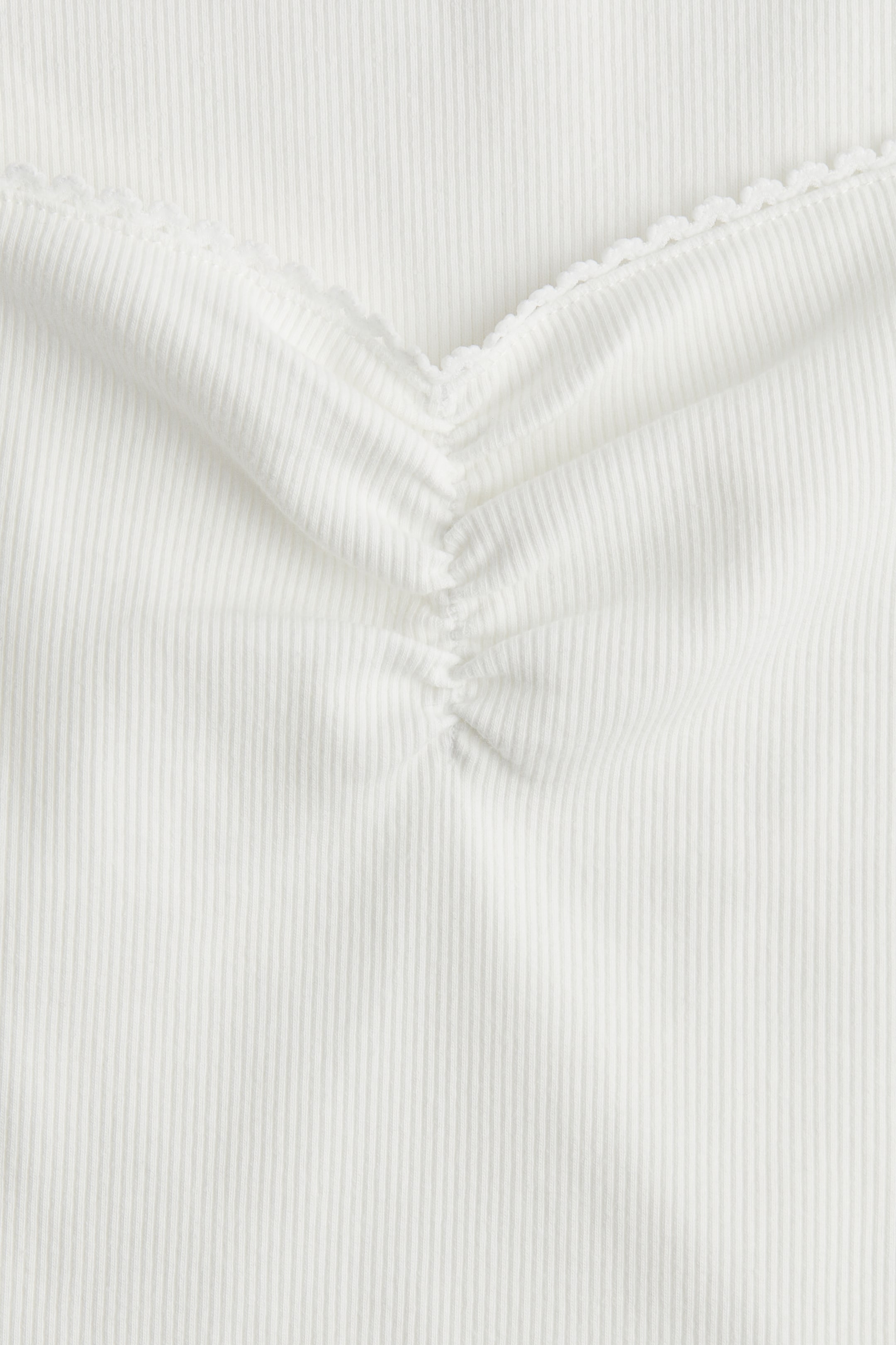 Short, fitted top in narrow-ribbed cotton jersey. Sweetheart neckline with delicate picot trim, gathered seam at center bust, and cap sleeves. Straight-cut hem.