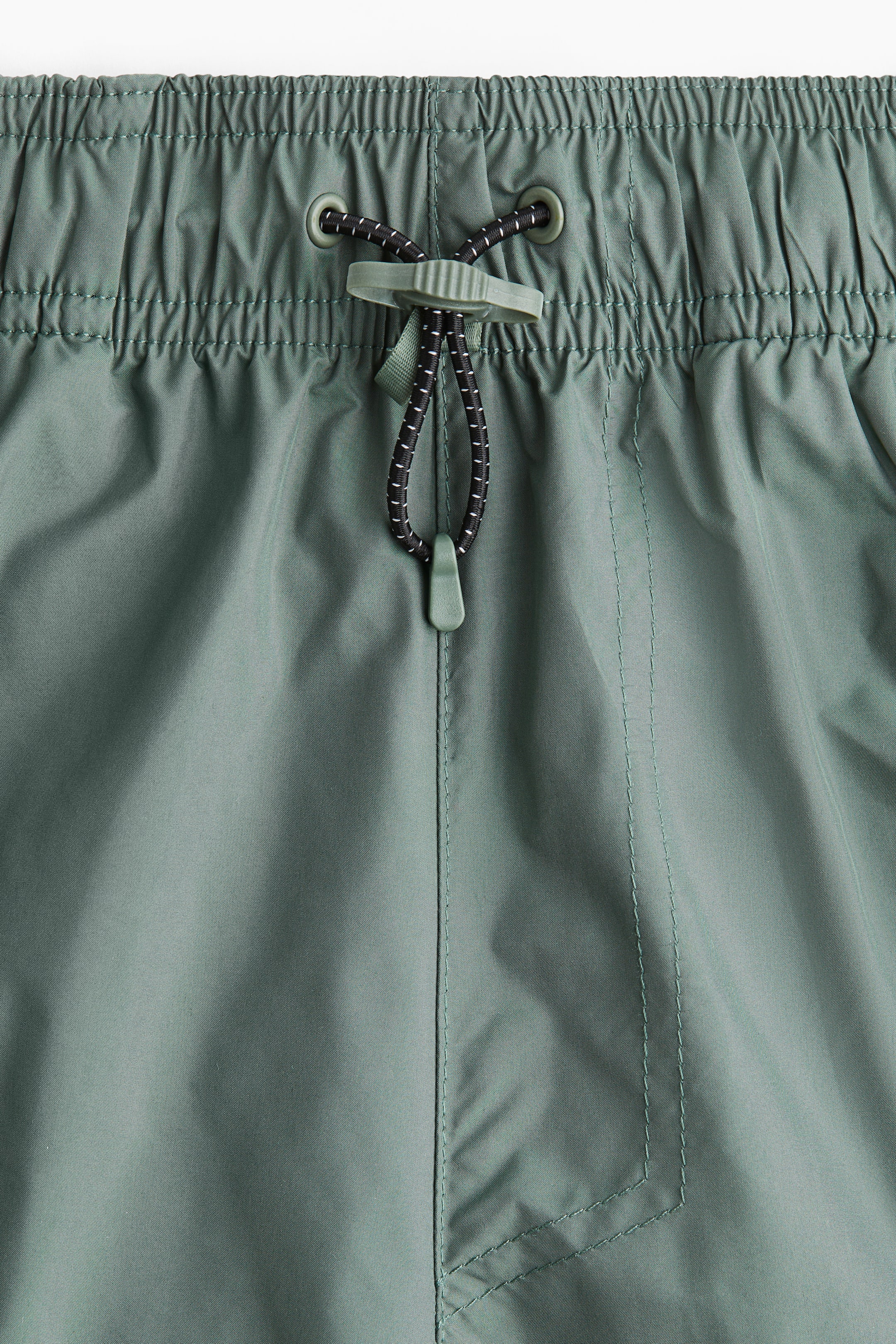 Long, loose-fit cargo shorts in soft, woven fabric. Elasticized drawstring, covered elastic at waistband, and mock fly. Diagonal side pockets, a mock back pocket, and two bellows leg pockets.