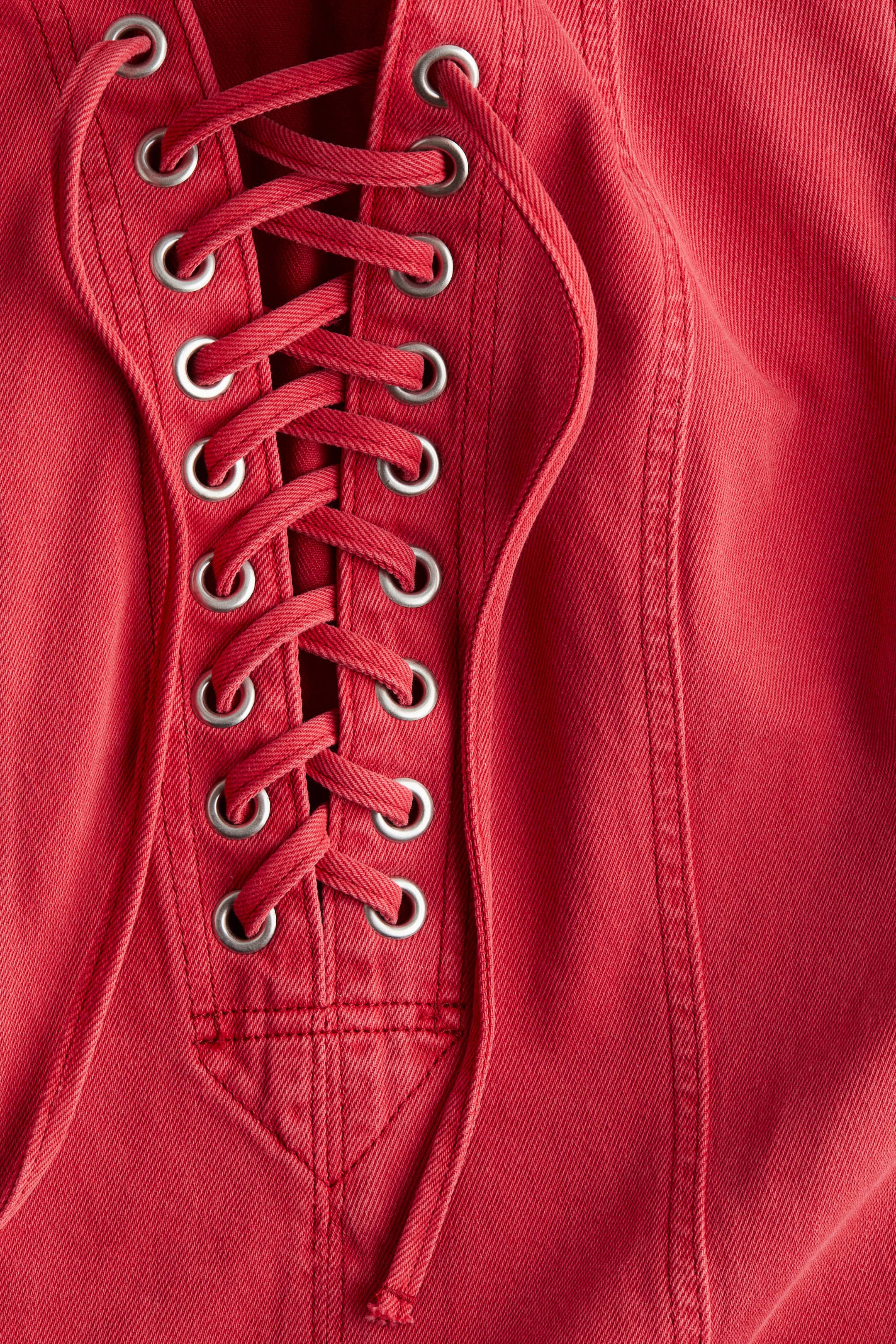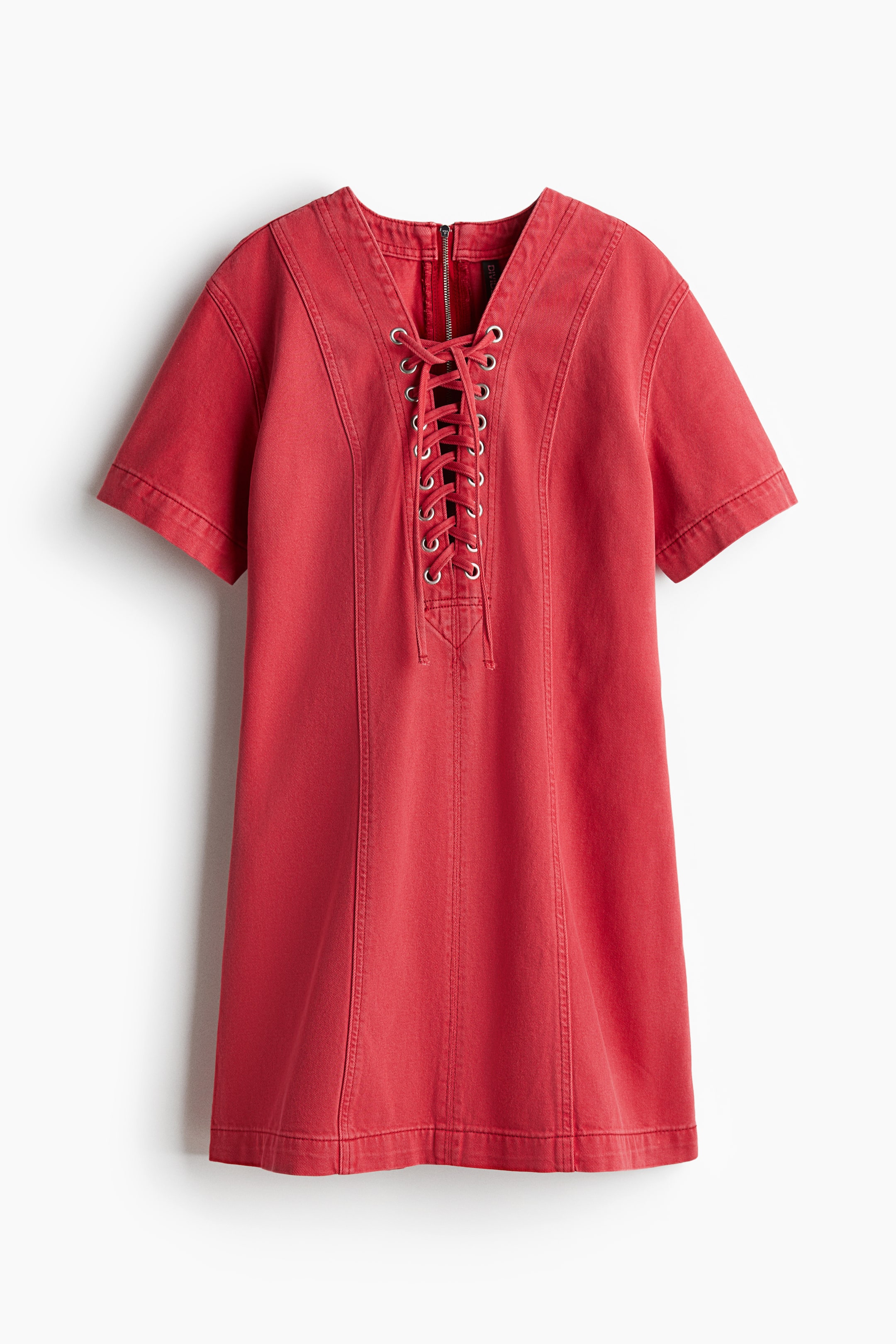 Short dress in rigid cotton denim with visible seams at front and back. Low-cut V-neck, lacing at front, and a zipper at back. Short sleeves. Unlined.