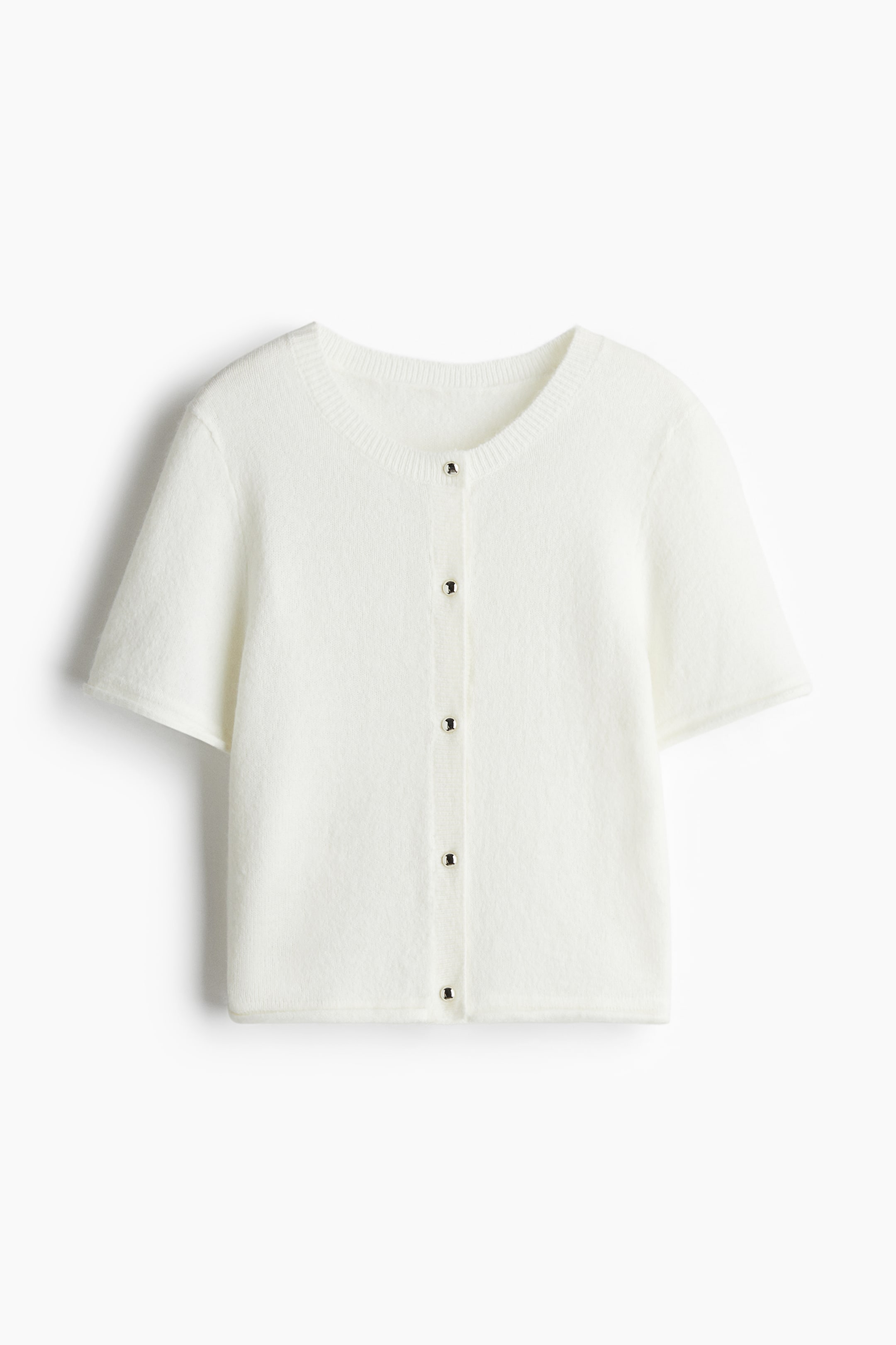 Short, fitted cardigan in a soft, fine knit. Round, ribbed neckline, ribbed placket with shimmery metallic buttons, and short sleeves. Rolled edges at cuffs and hem.