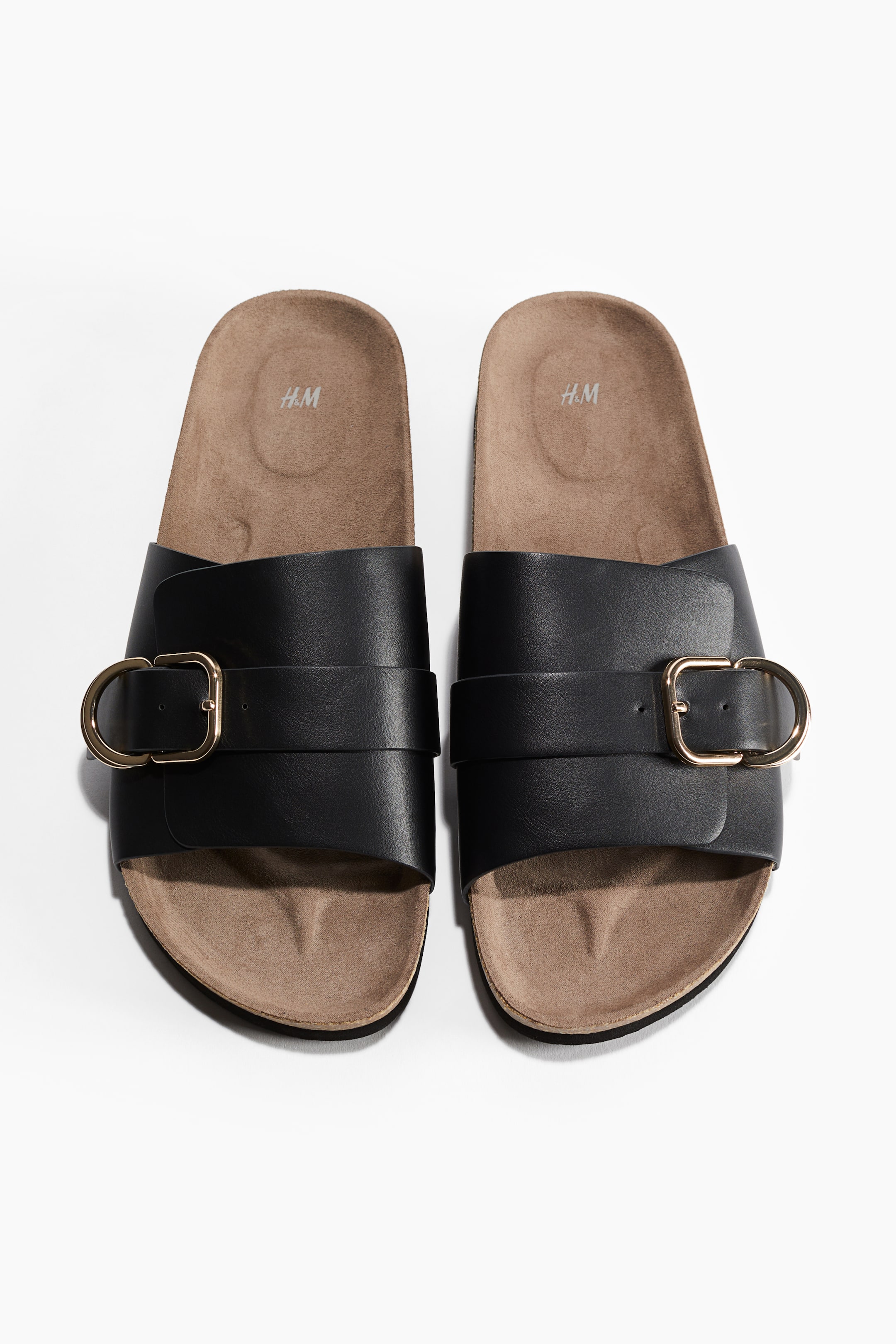 Sandals in coated fabric. Oblique toes and a wide, adjustable foot strap with a wrap detail and metal buckle. Satin lining and molded insoles.