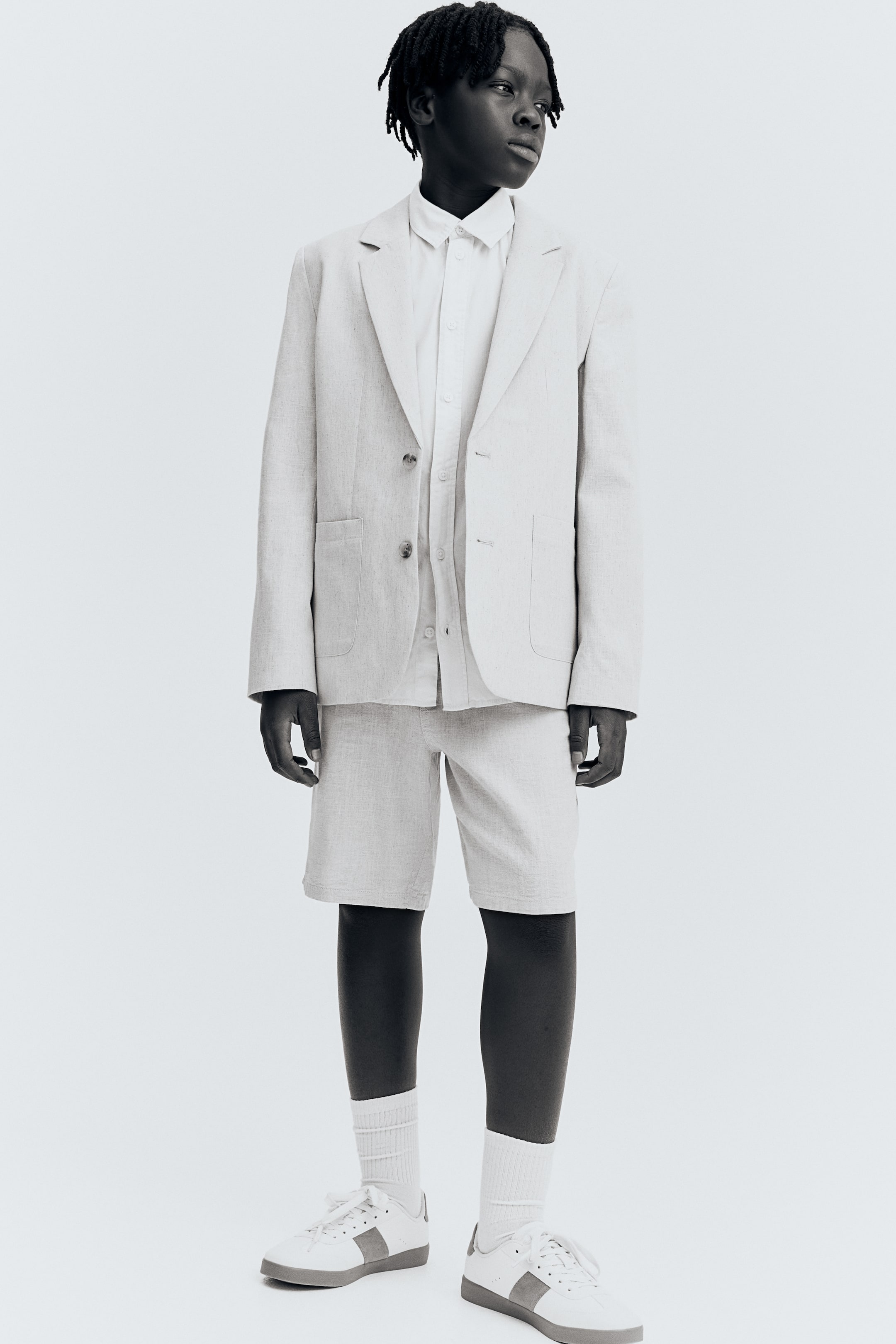 Shorts in a woven cotton and linen blend. Elasticized drawstring waistband, mock fly, diagonal front pockets, and an open back pocket.