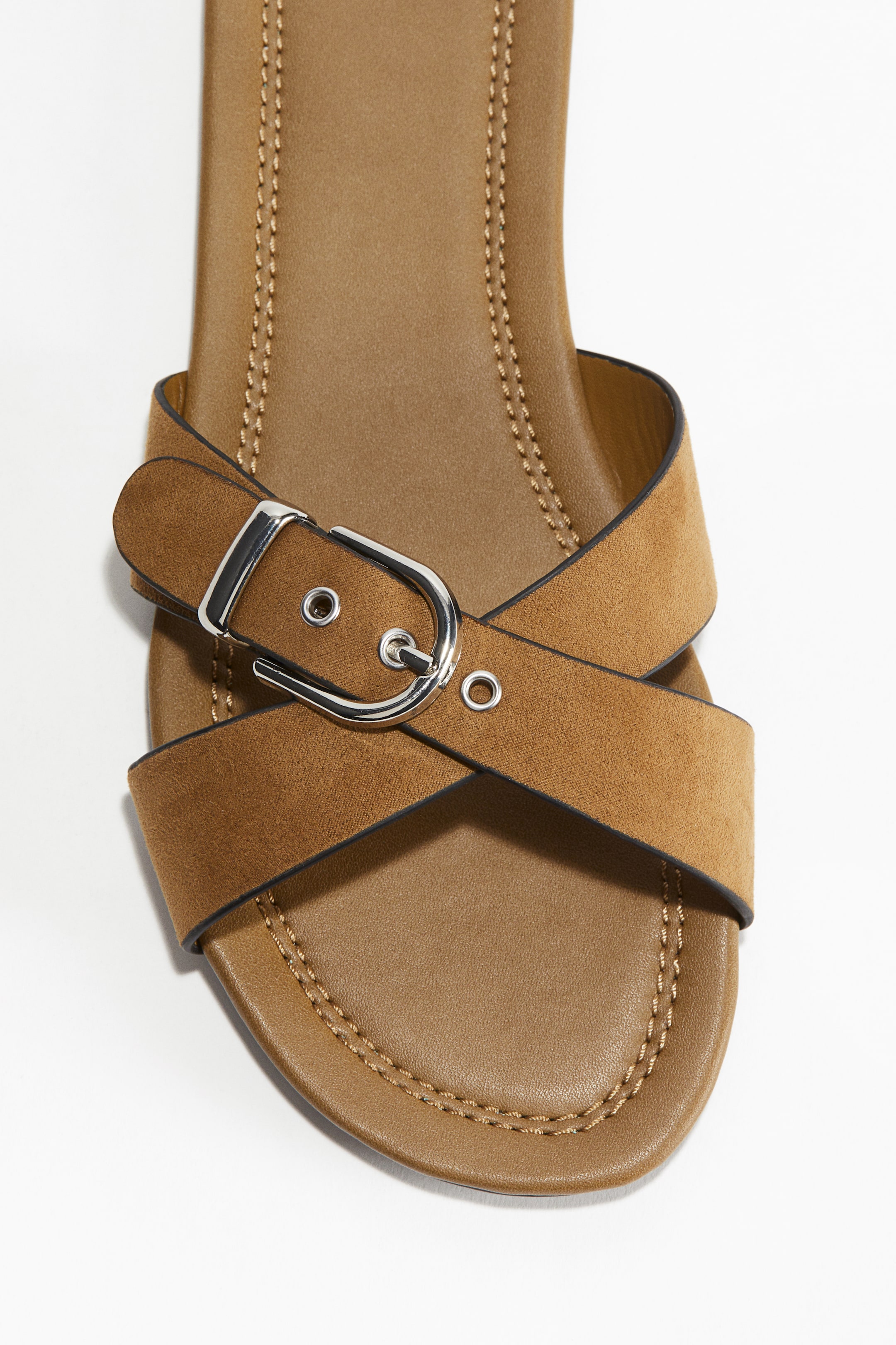 Sandals with rounded toes and adjustable crossover foot straps with a metal buckle.