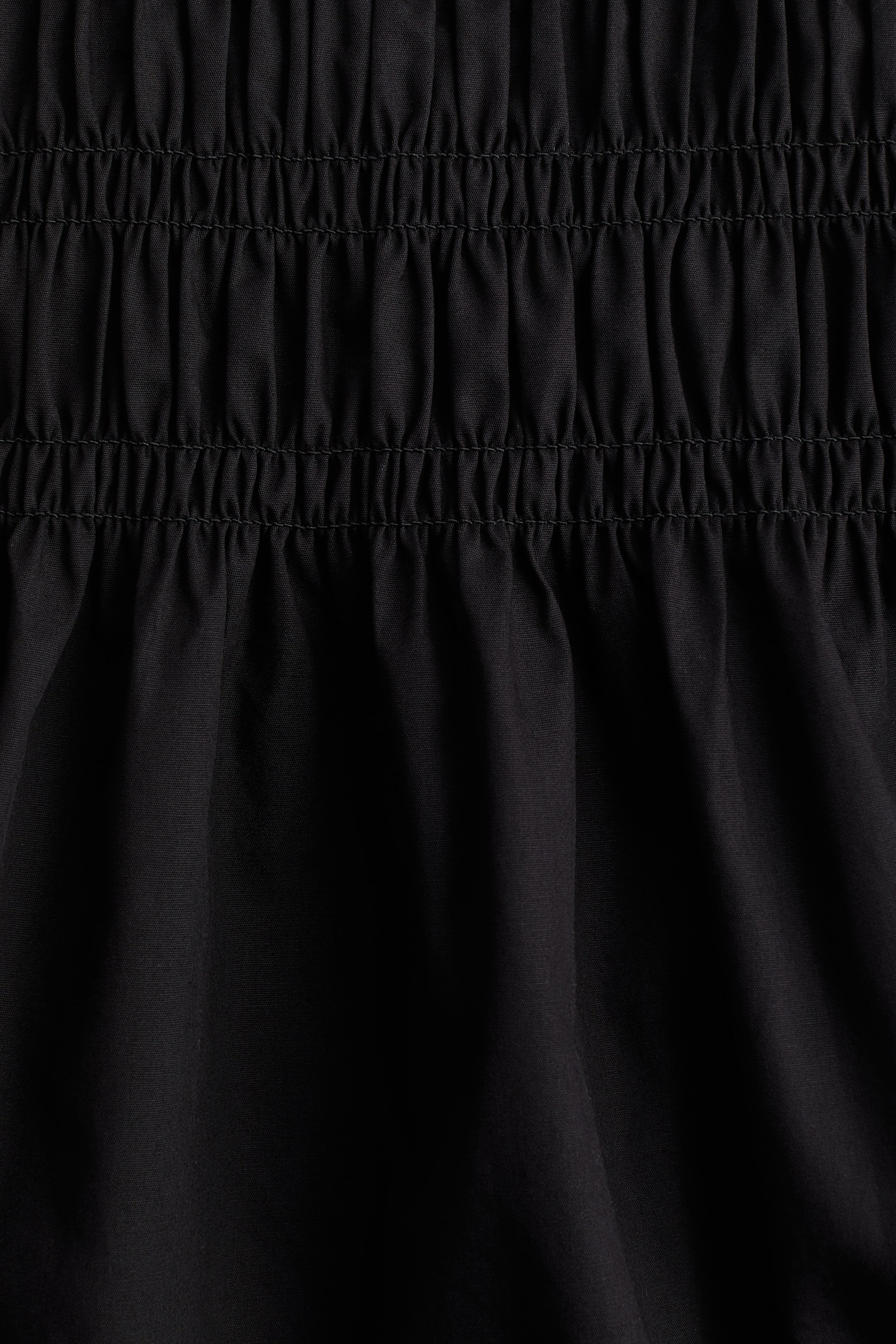 Short dress in woven cotton with a smocked bodice and flared skirt. Doubled extra-narrow shoulder straps that thread through small loops and tie at back. Square neckline and a gathered seam at waist. Lined.