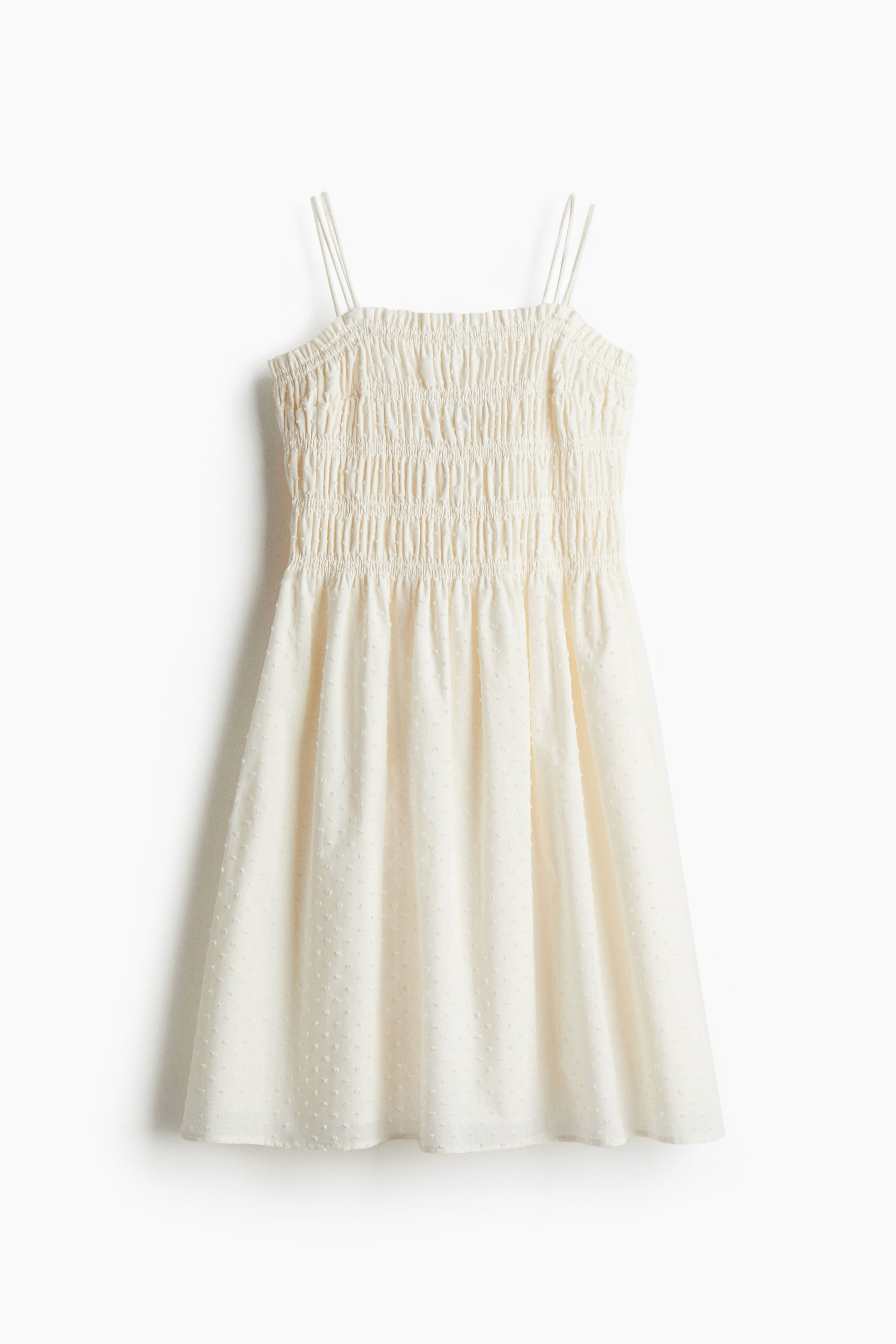 Short dress in woven cotton with a smocked bodice and flared skirt. Doubled extra-narrow shoulder straps that thread through small loops and tie at back. Square neckline and a gathered seam at waist. Lined.