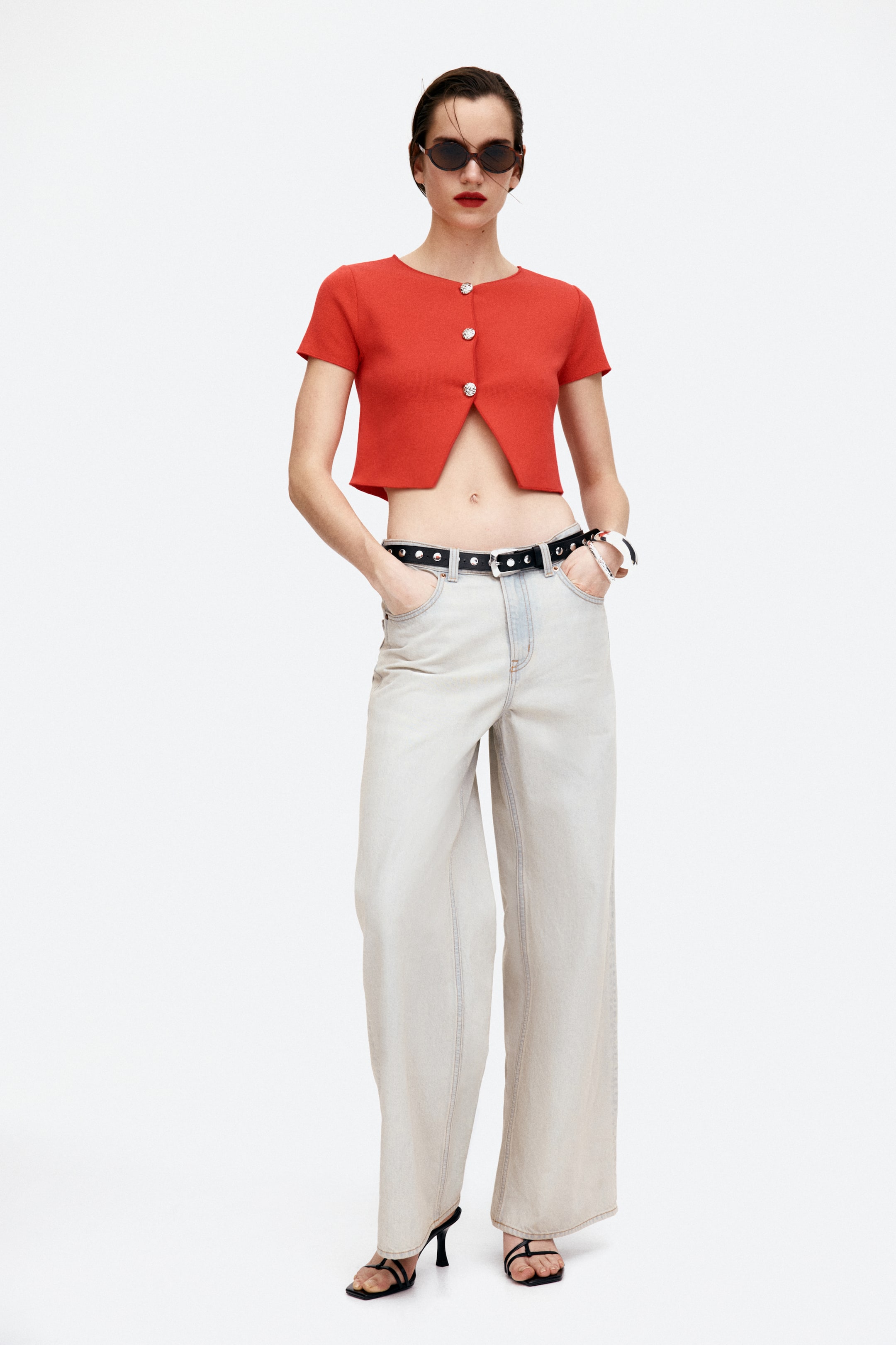 Short, fitted cardigan in stretch jersey. Textured metal buttons at front, short sleeves, and a straight-cut hem with angled edges at lower end of placket.