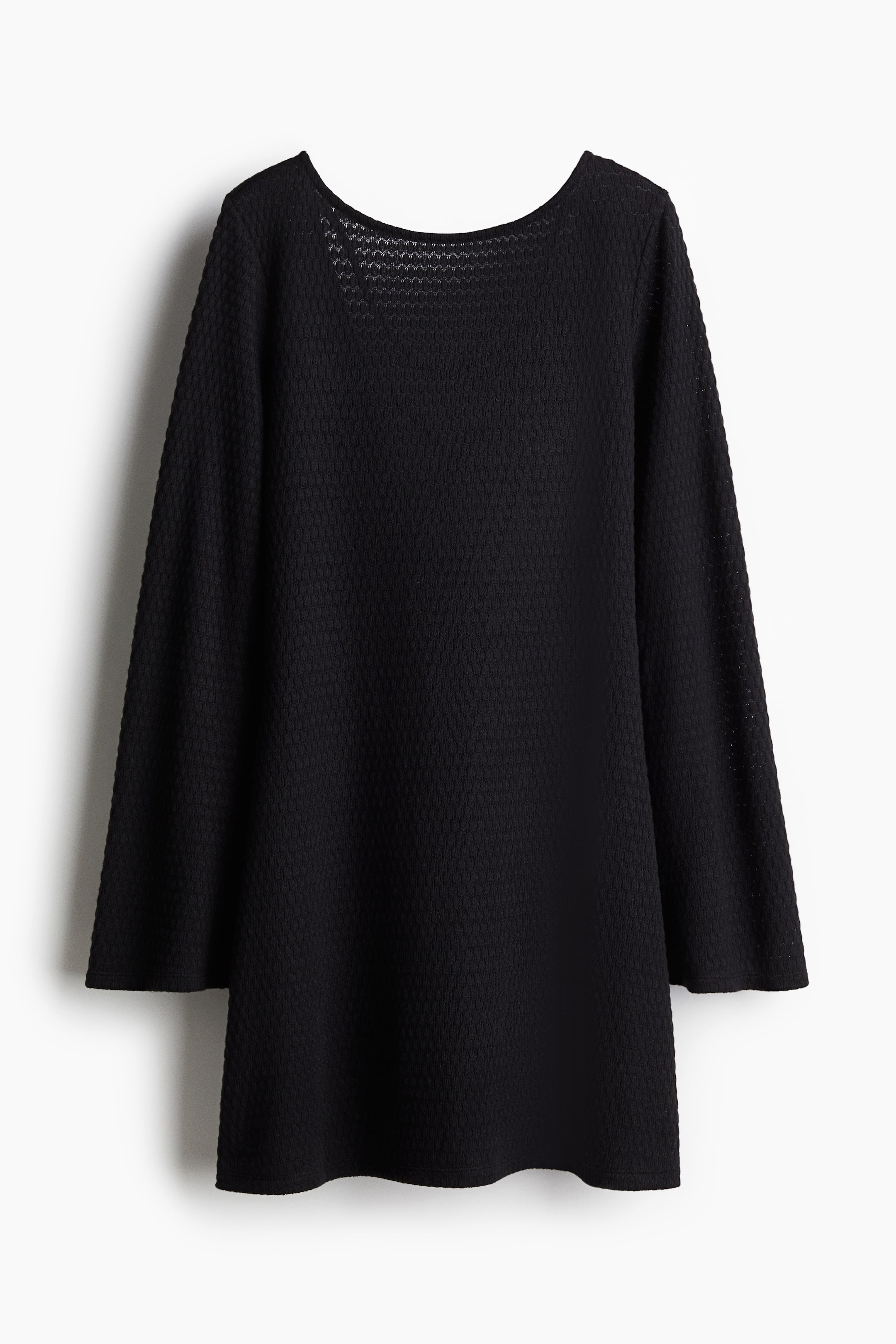 Short, fitted beach dress in a sheer knit. Round neckline at front and a low-cut back with decorative, extra-narrow crossover ties at back with plastic beads at ends. Long, flared sleeves and a gently flared skirt.