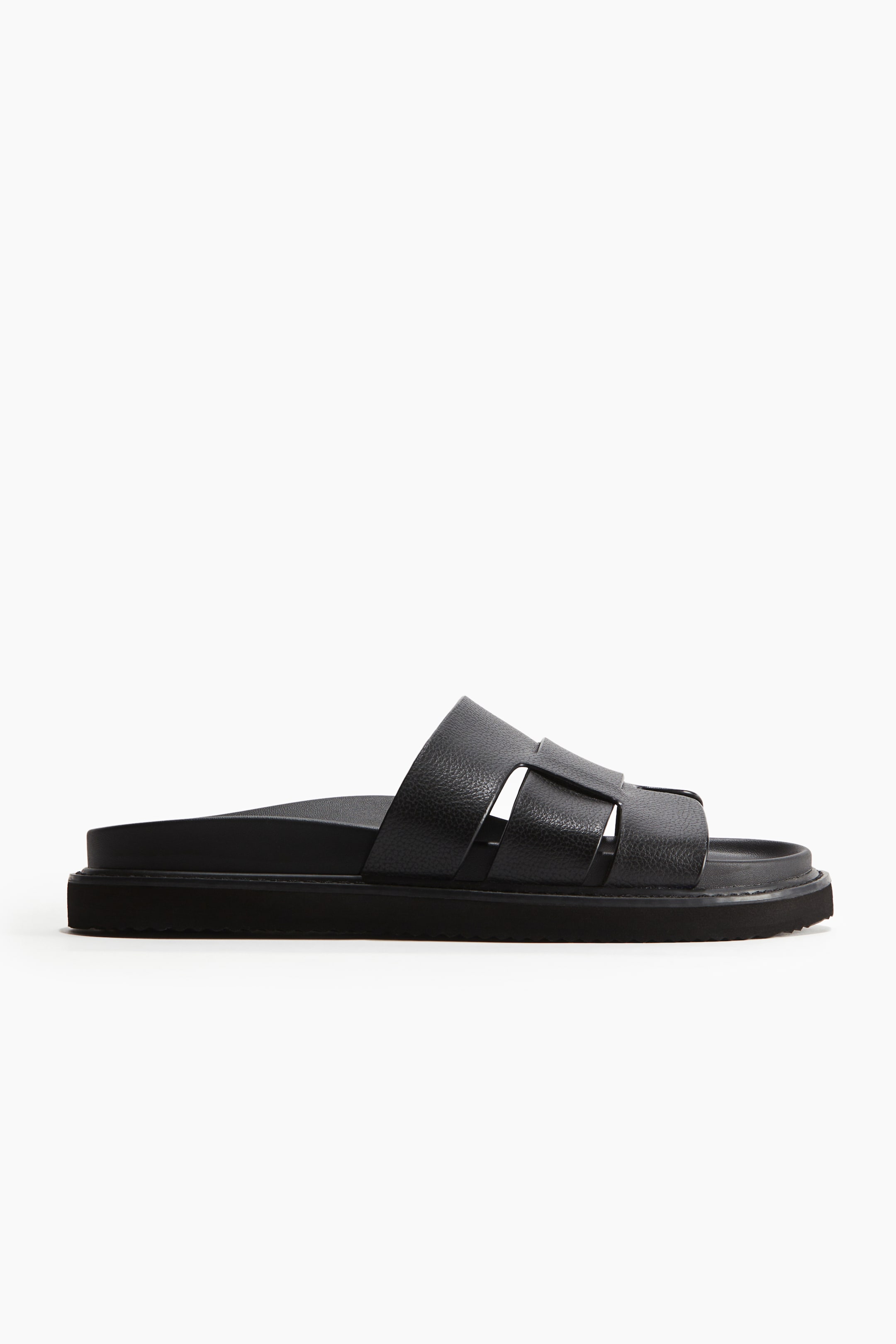 Slide sandals in coated fabric. Molded insoles and patterned soles.