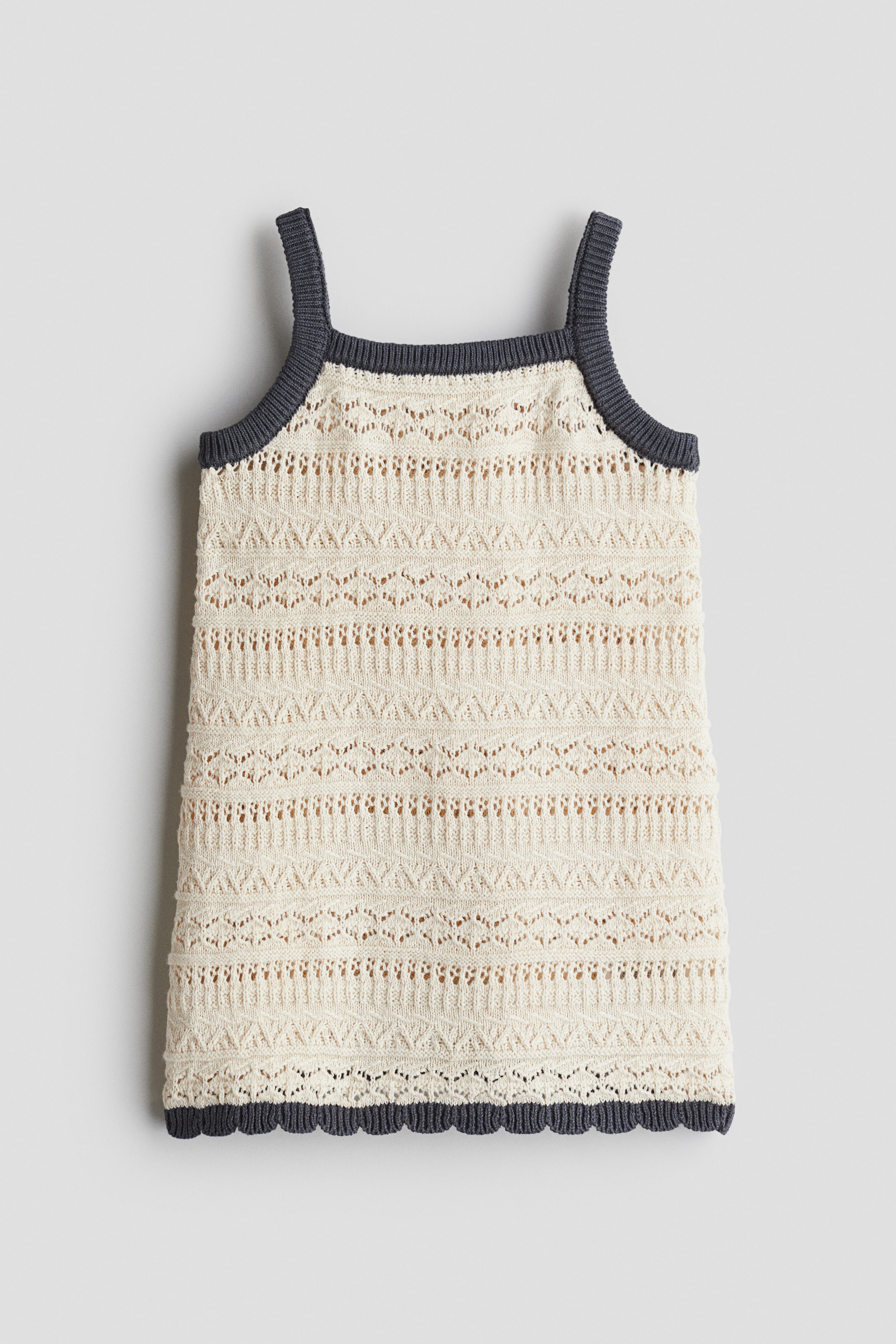 A-line knit dress in crochet-look cotton. Narrow shoulder straps, square neckline, and a scalloped-edge hem.