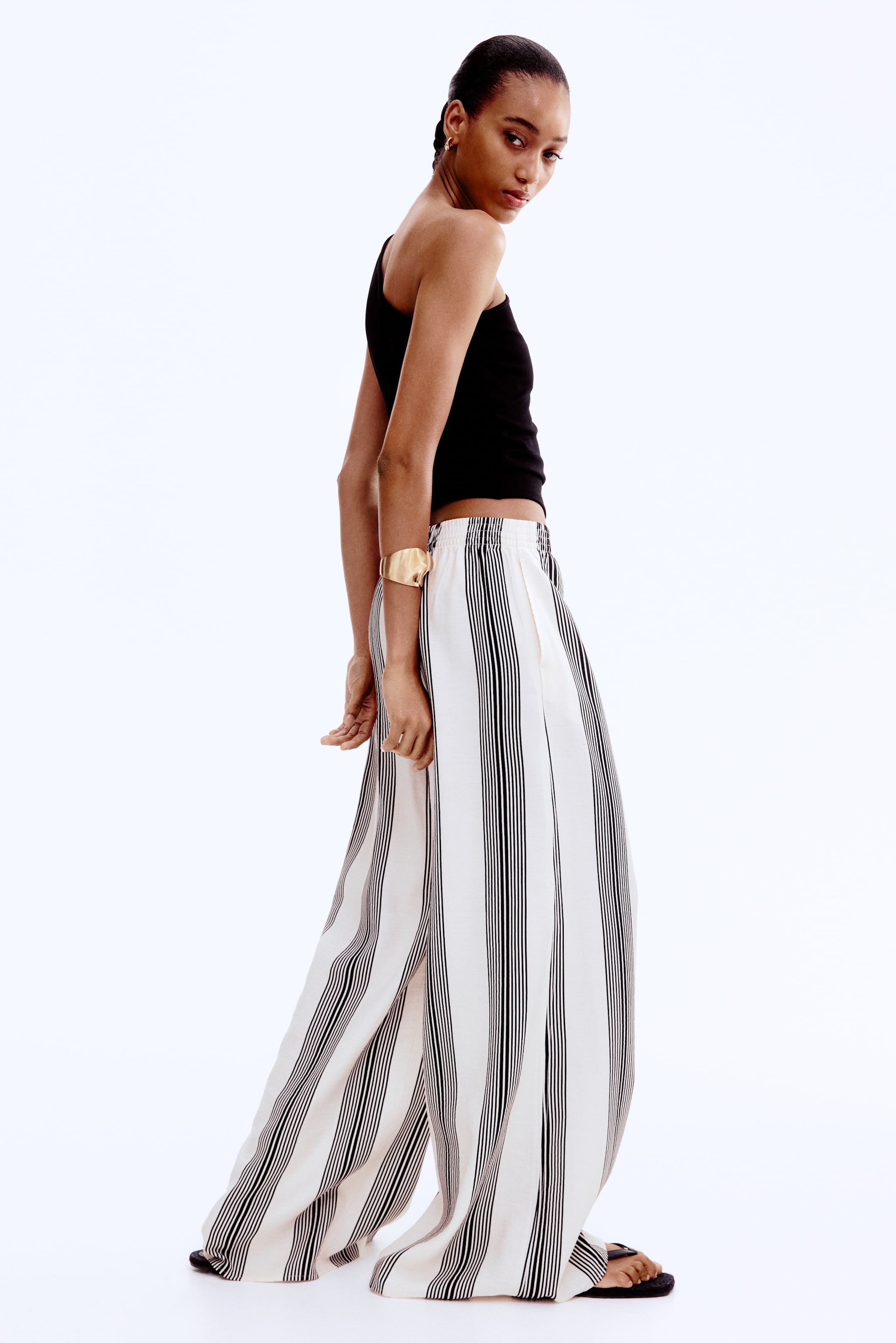 Loose-fit pants in woven fabric. High waist, elasticized waistband, and discreet side pockets. Wide legs.