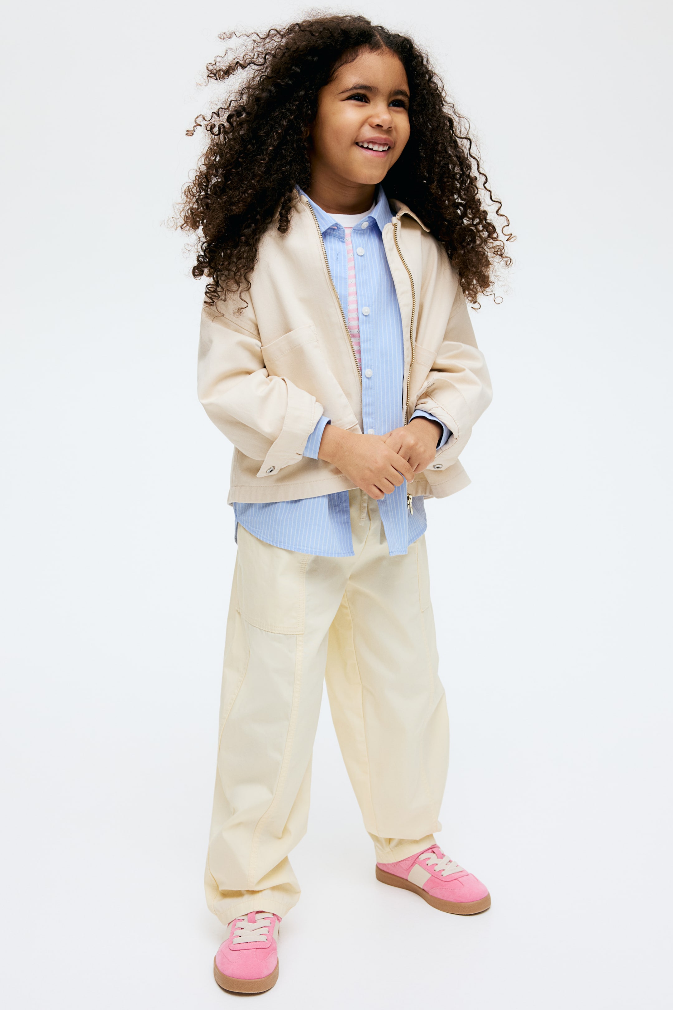 Cargo pants in cotton poplin with a relaxed fit through hip and thigh. Drawstring and covered elastic at waistband, two front pockets with flap, and a decorative vertical seam at front and back of legs. Tapered legs.
