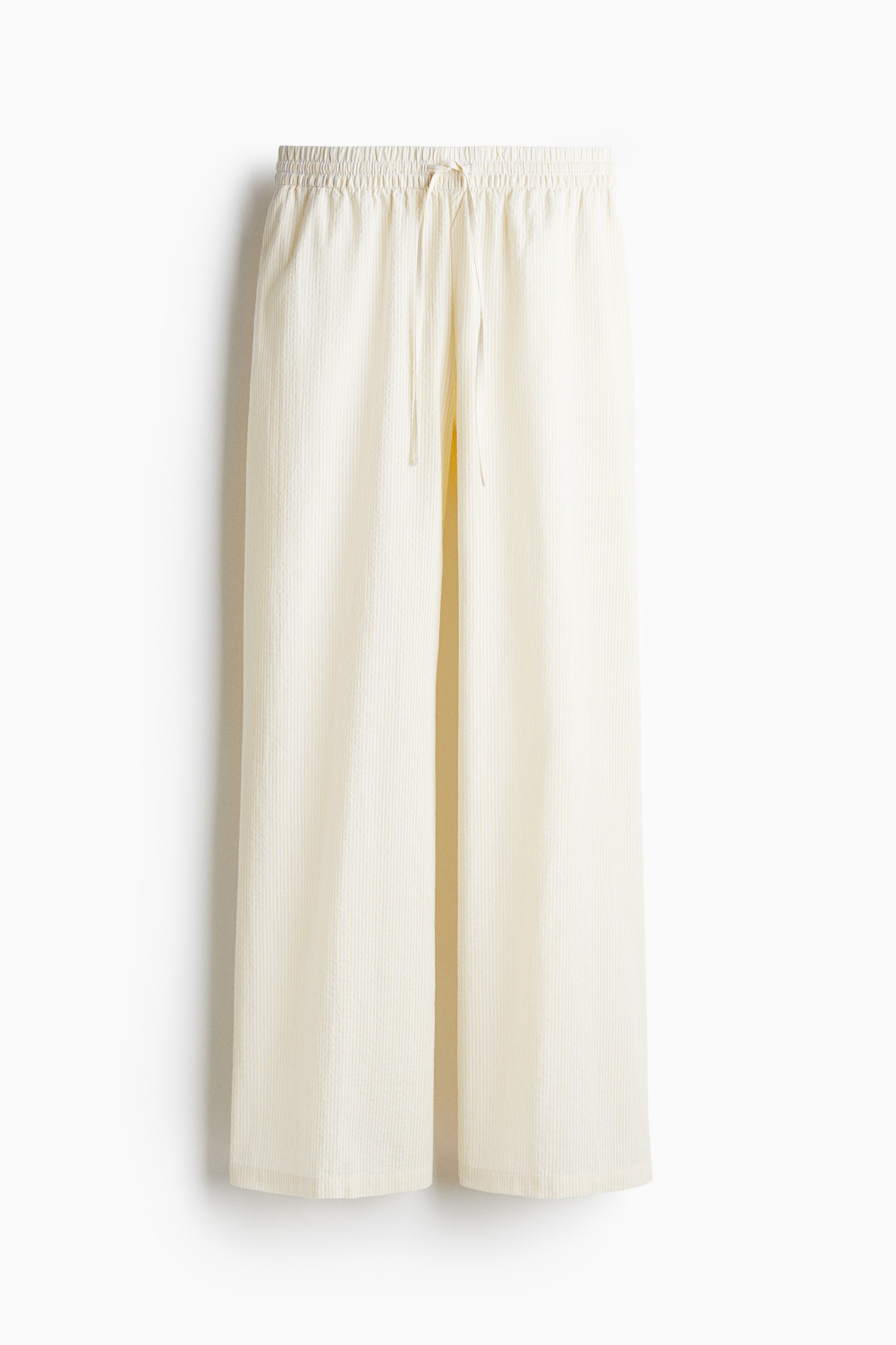 Pants in cotton seersucker. Drawstring and smocked elastic at waistband, side pockets, and wide legs.