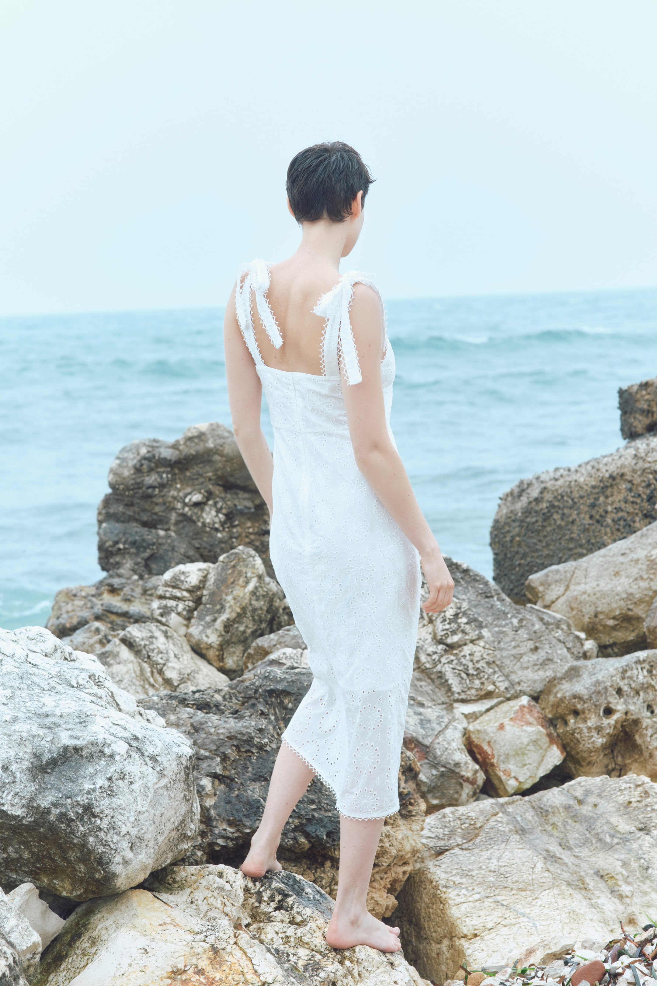 Calf-length dress in eyelet-embroidered woven cotton with a fitted bodice. Wide, tie-top shoulder straps, V-neck, and a concealed zipper at back. Decorative picot trim at shoulder straps, neckline, and hem. Lined.