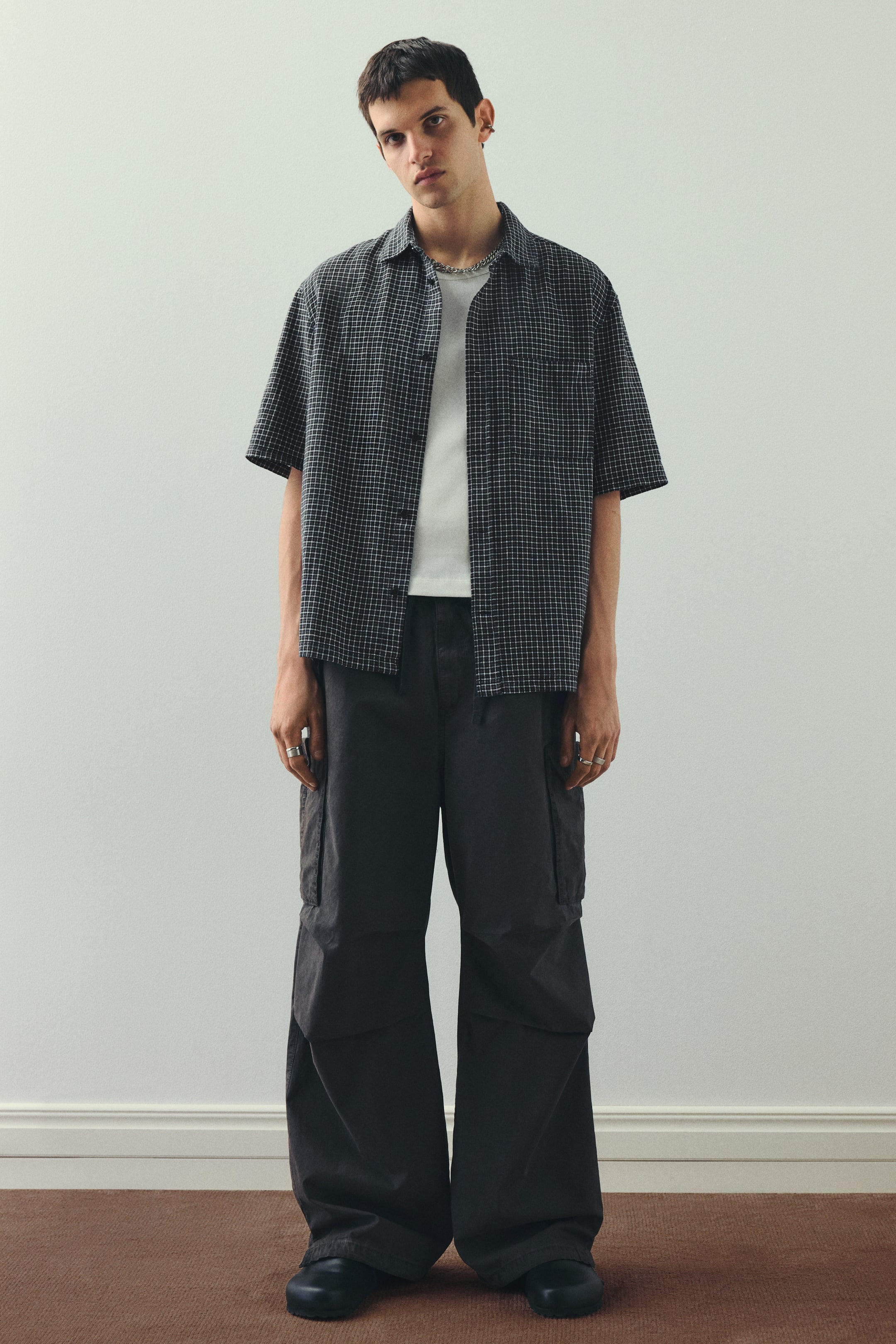 Oversized, short-sleeved shirt in an airy cotton and linen blend with an extra-loose silhouette. Turn-down collar, classic button placket, an open chest pocket, and a straight-cut hem. Cotton and linen blends combine the softness of cotton with the sturdiness of linen, creating a beautiful, textured fabric that is breathable and perfectly draped.