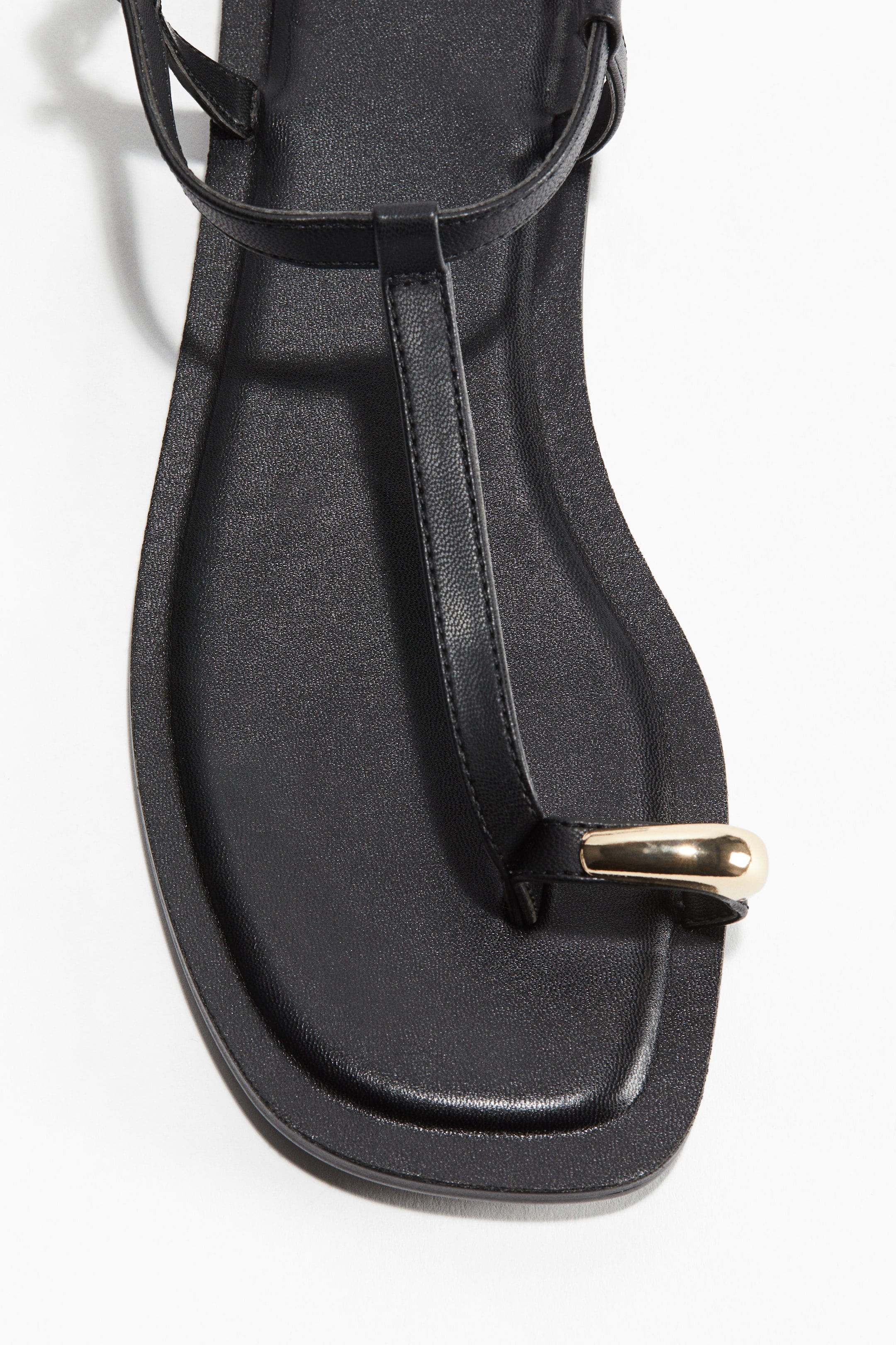 T-strap sandals in coated fabric with a toe loop embellished with a chunky metal detail. Adjustable ankle strap with a round metal buckle.