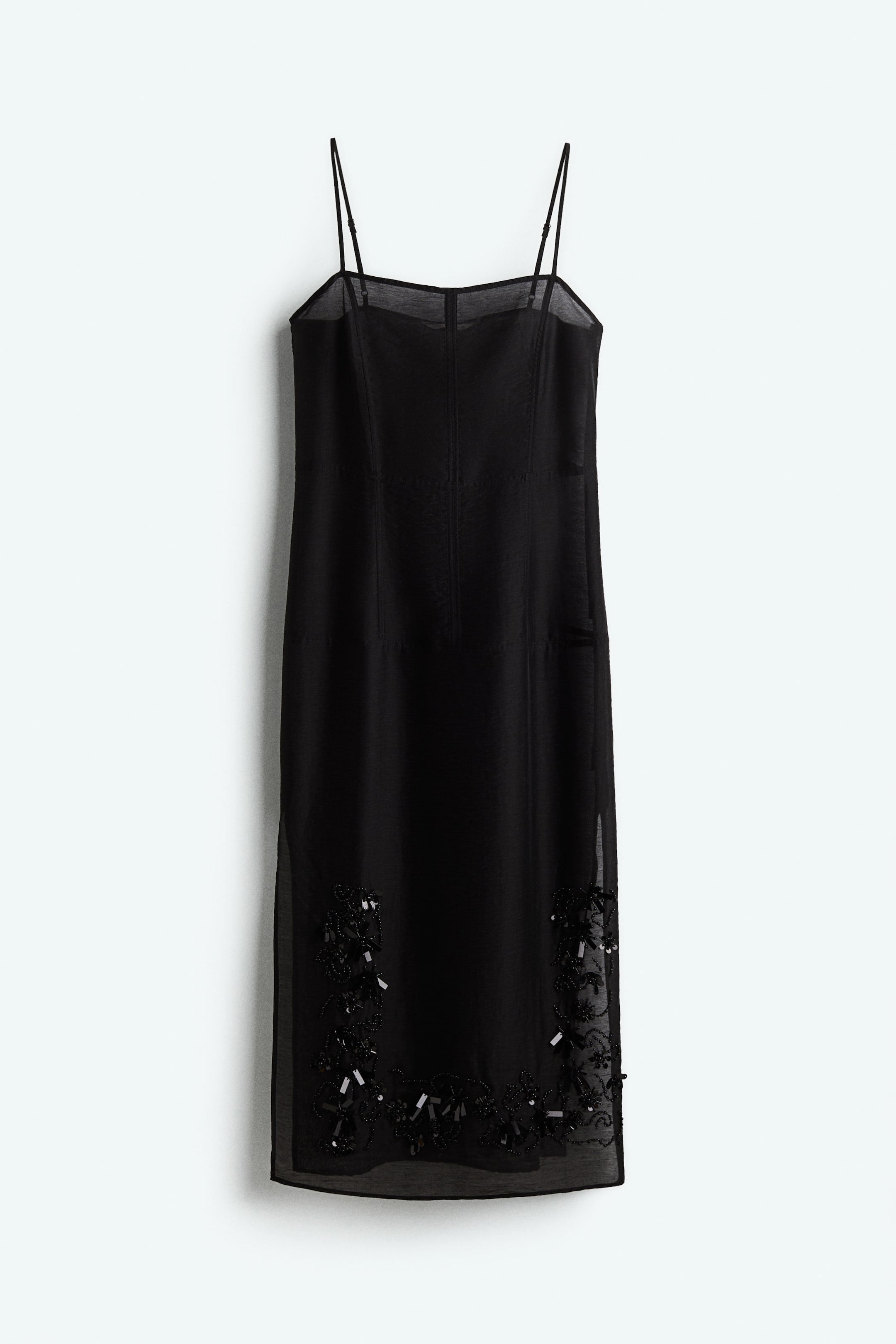 Calf-length dress in sheer, woven fabric. Adjustable, extra-narrow shoulder straps, fitted bodice, and a concealed zipper at back with hook-and-eye fastener. Straight skirt, slit at sides, and decorative tone-on-tone sequins and beads at hem. Unlined.