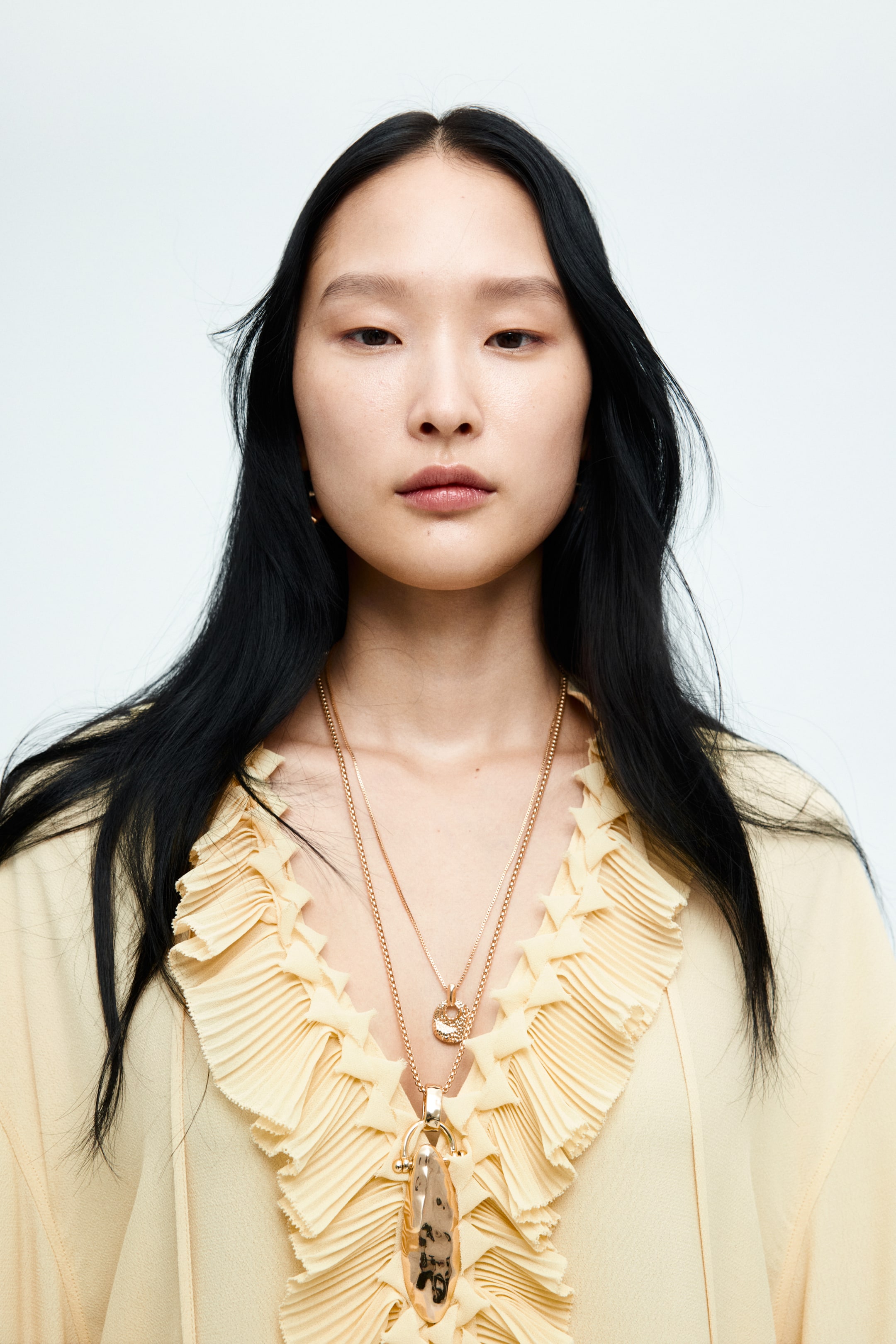 Oversized tunic in sheer, woven viscose crêpe fabric. Band collar, deep slit at front with pleated ruffles and long, extra-narrow ties, and a double-layered yoke at back with pleats. Dropped shoulders, long sleeves, and wide, ruffle-trimmed cuffs with a slit and buttons. Straight-cut hem.