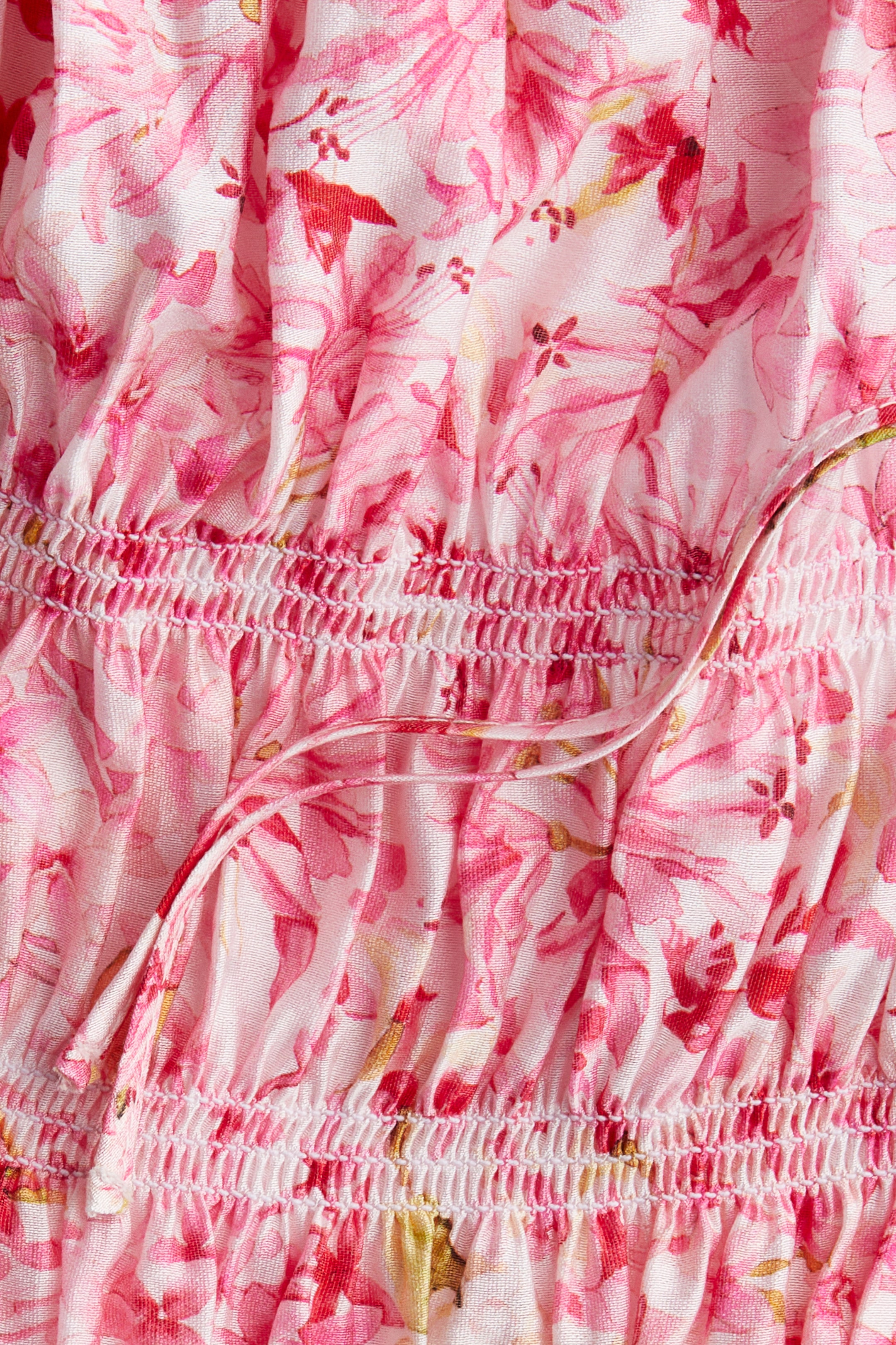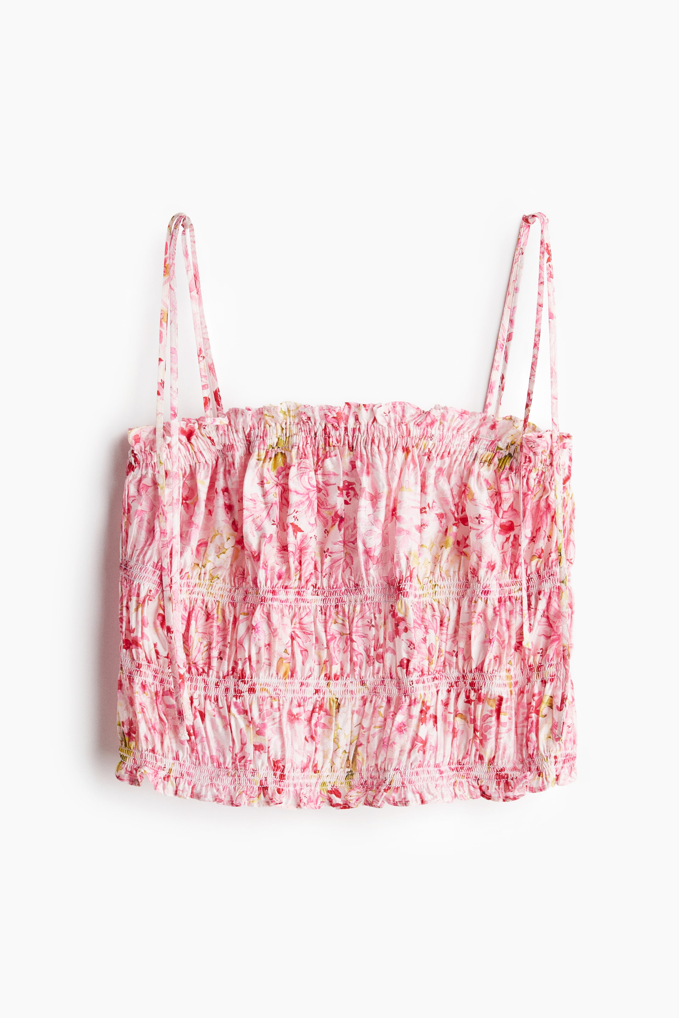 Short, fitted top in smocked woven fabric. Narrow, tie-top shoulder straps, straight neckline, and ruffle trim at upper edge and at hem.