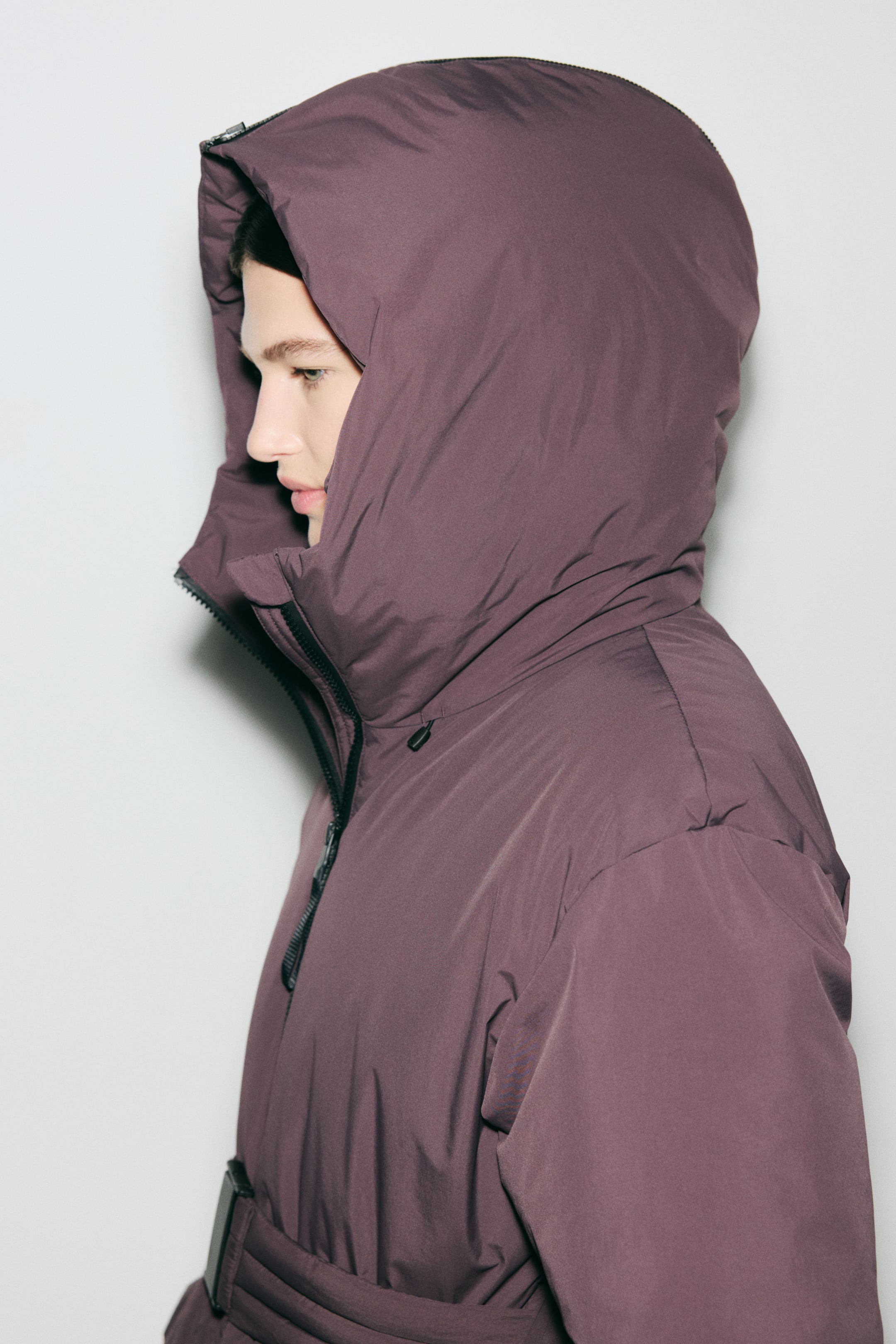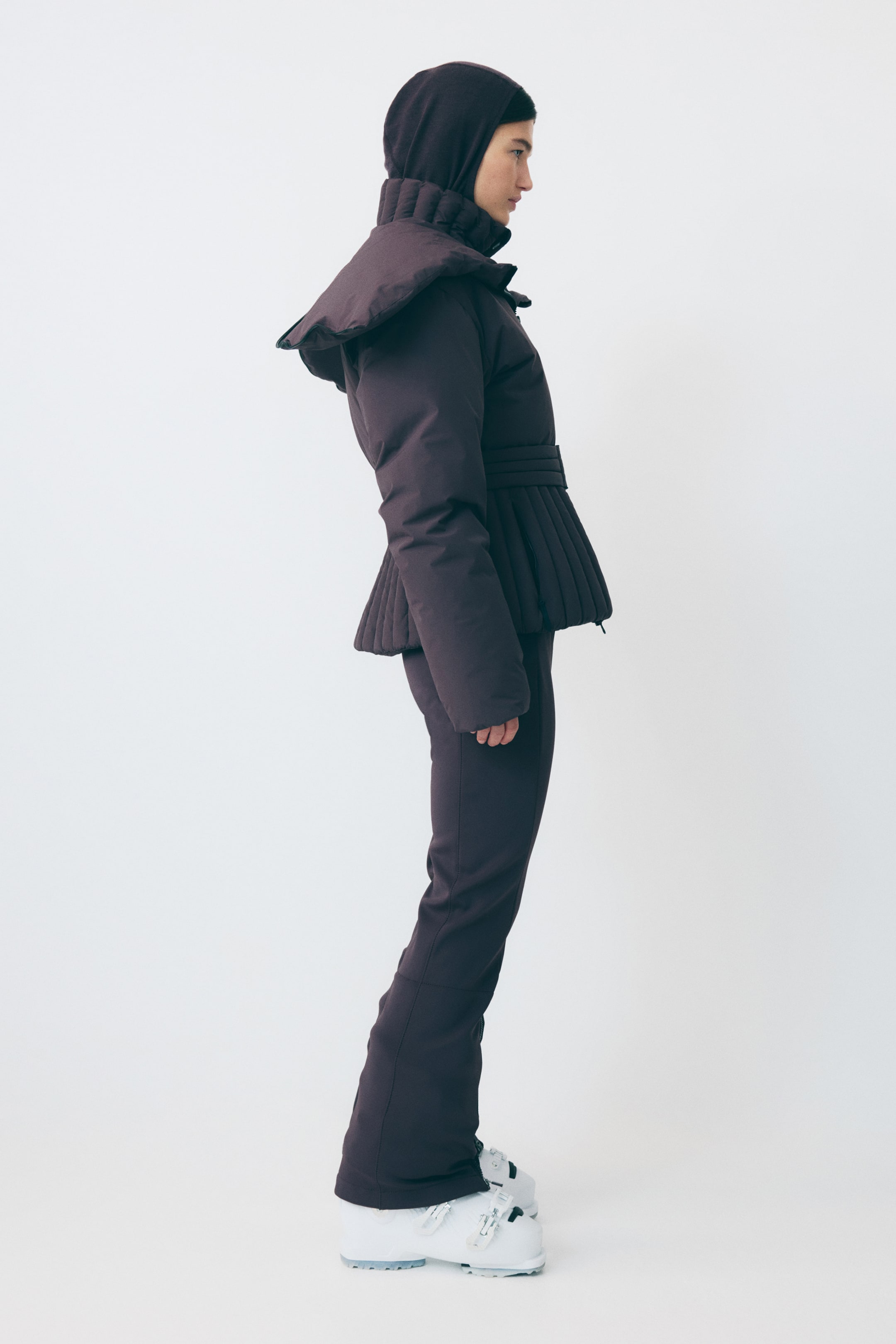 Padded ski jacket in water-repellent functional fabric made with ThermoMove™ to keep you warm when the temperature drops. Hood with an elasticized drawstring at front and a zipper extending from top of head to back of neck, allowing it to be folded into a collar. Integrated stand-up collar inside in padded, quilted woven fabric. Discreet side pockets with zipper, an inner pocket with zipper, sleeve pocket with zipper, and an open inner pocket in soft mesh with a goggle cloth. Dropped shoulders, long sleeves, and inner cuffs with thumbholes. Elasticized belt at waist with a plastic buckle. Quilted, gently flared hem with a concealed drawstring and an integrated snow gaiter at front with snap fasteners.