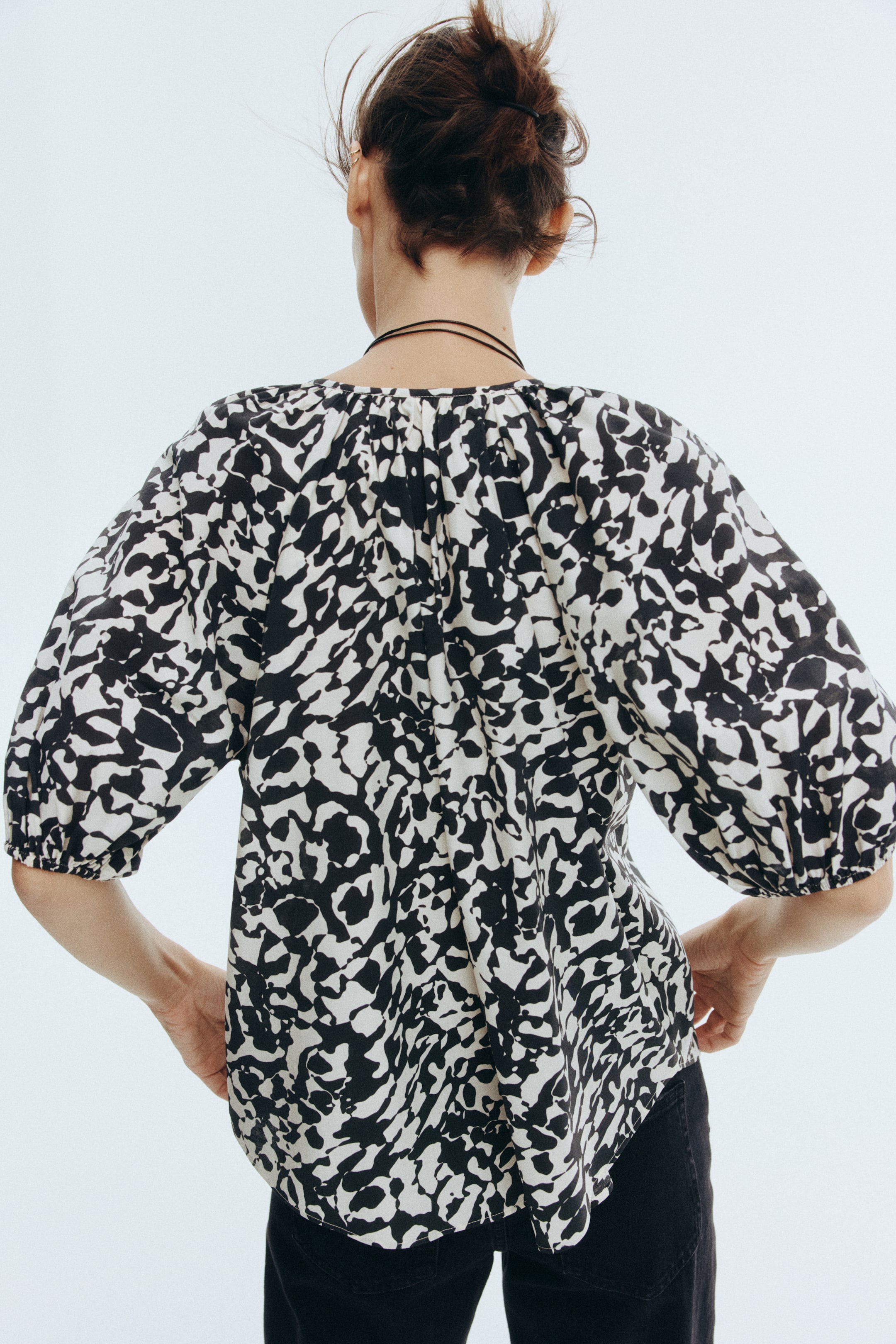 Blouse in woven fabric. Round, gathered neckline, concealed buttons at front, and short balloon sleeves with elasticized cuffs. Rounded hem.