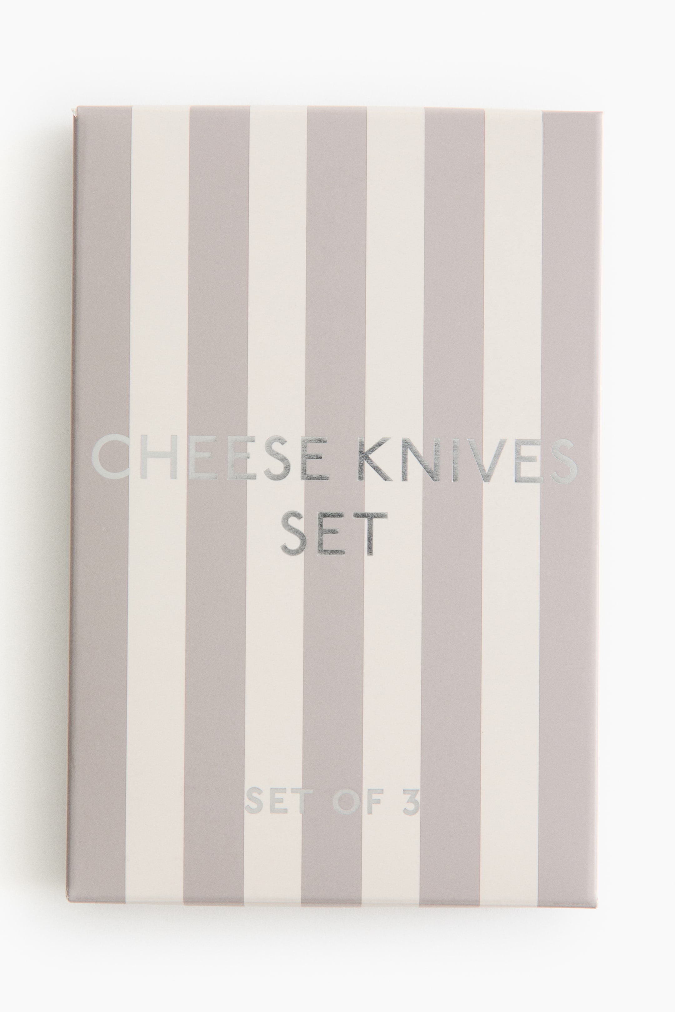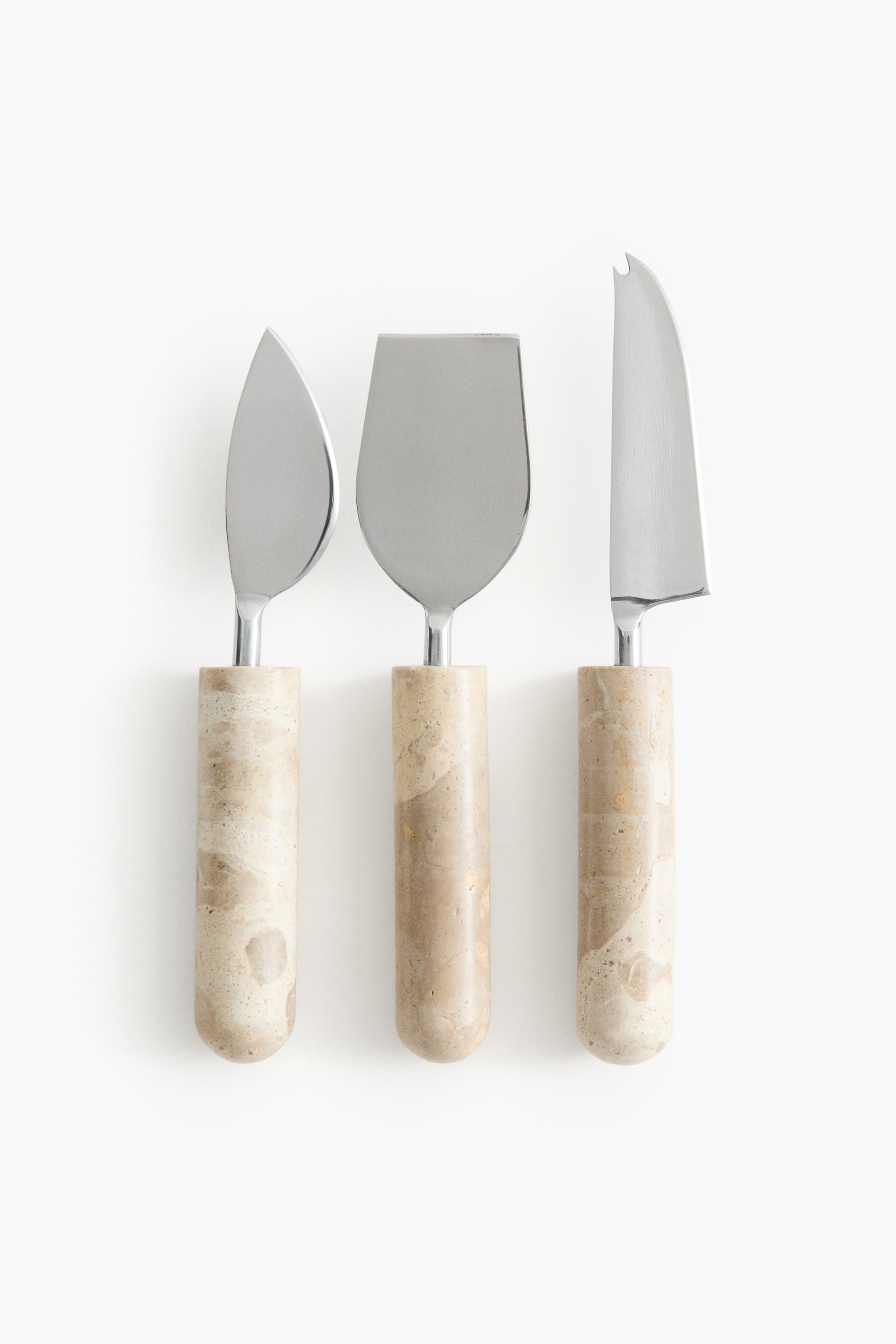 Set of three cheese knives with marble handles. Set includes one heart-shaped knife, one serving knife, and one chisel knife. Marble is a natural material, meaning color and texture of each product may vary. Heart-shaped knife length 6 in. Serving knife length 6 3/4 in. Chisel knife length 6 in.