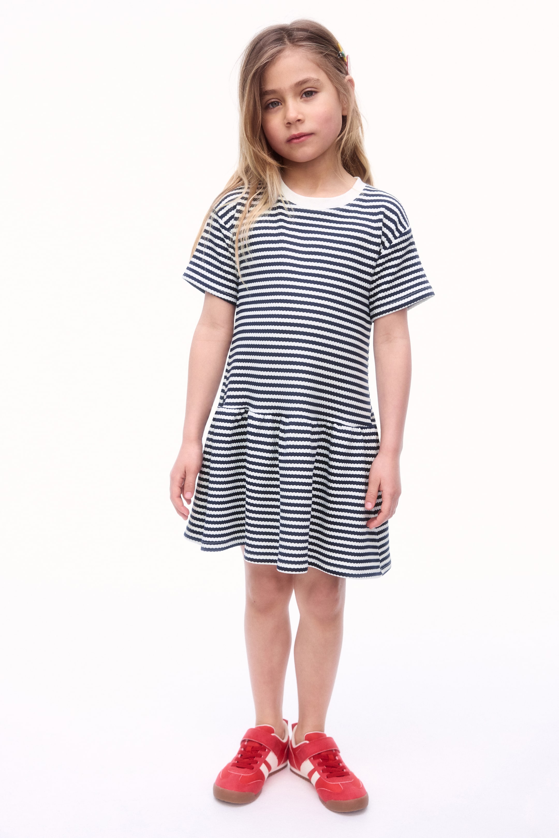 Dress in soft, cotton-blend jersey. Round neckline, dropped shoulders, and short sleeves. Gathered seam below midsection for added volume.