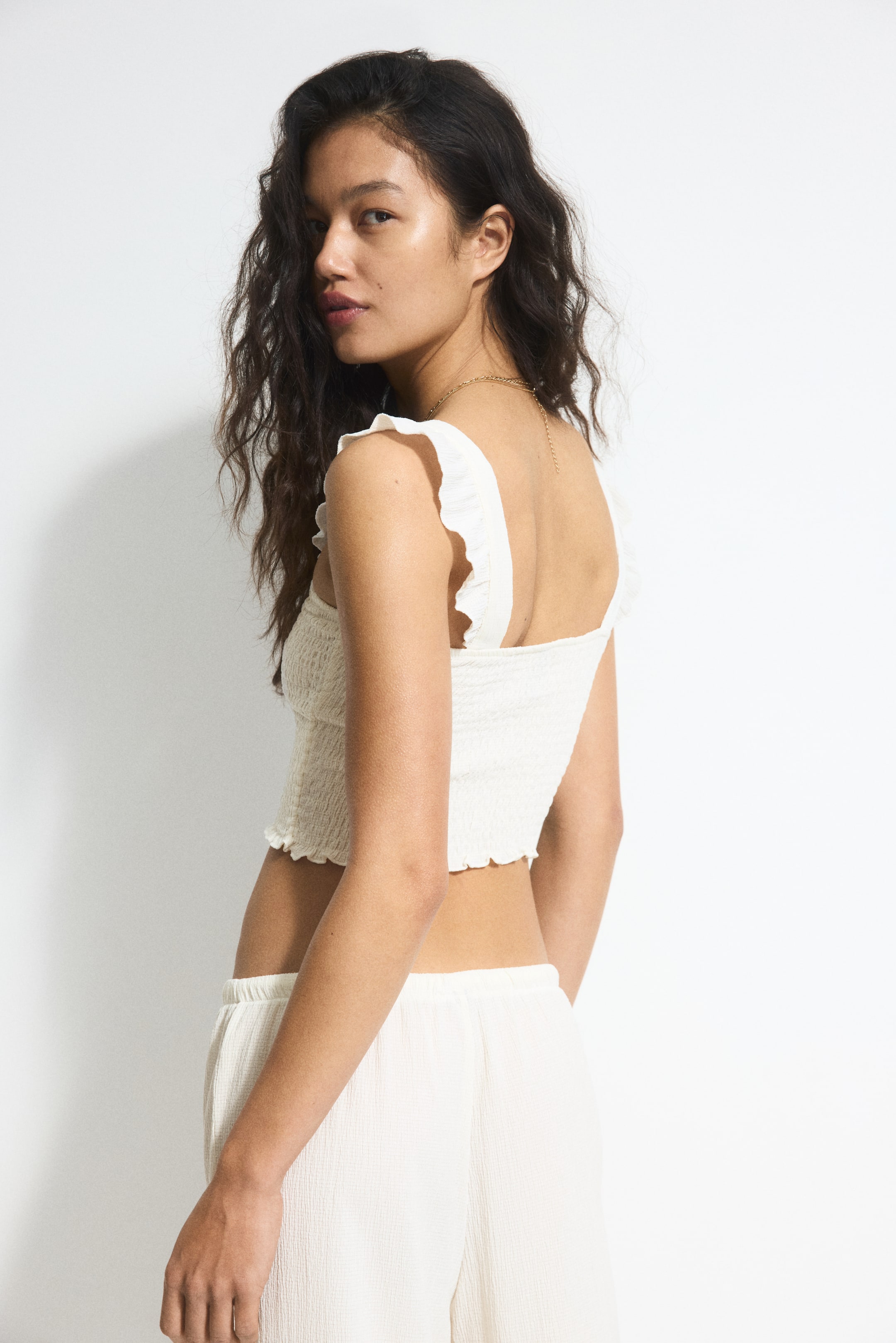 Fitted crop top in smocked jersey. Flounce-trimmed shoulder straps.